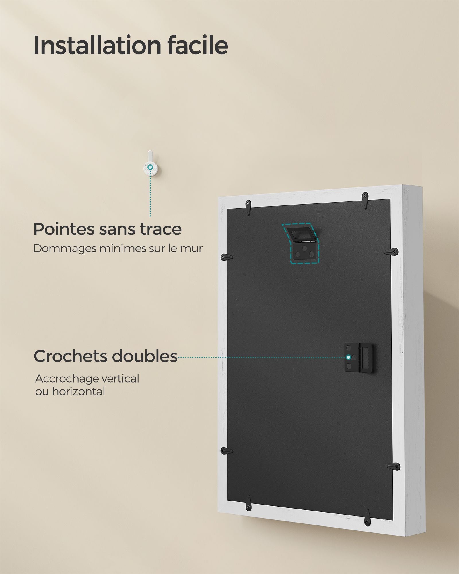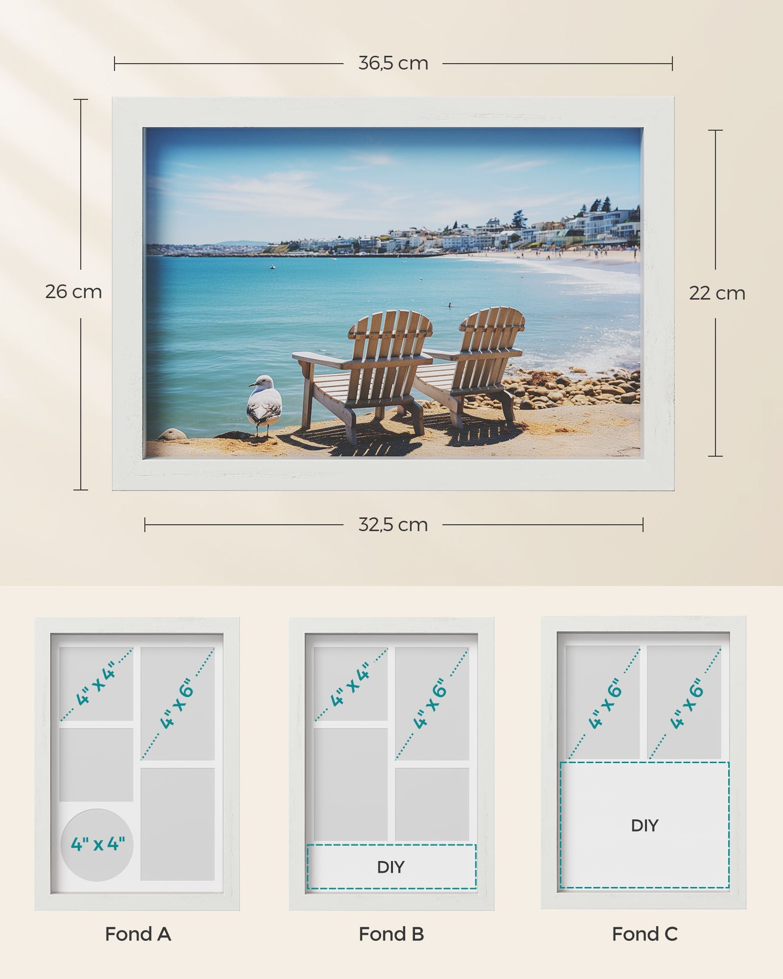Ce cadre photo a été conçu pour mettre en valeur vos souvenirs tout en s’adaptant à différents formats. Avec ses dimensions de 36,5 x 26 x 4 cm, il accueille facilement des images au format A4, 4x6 ou 4x4, permettant ainsi de varier les présentations et de profiter pleinement de vos collections.