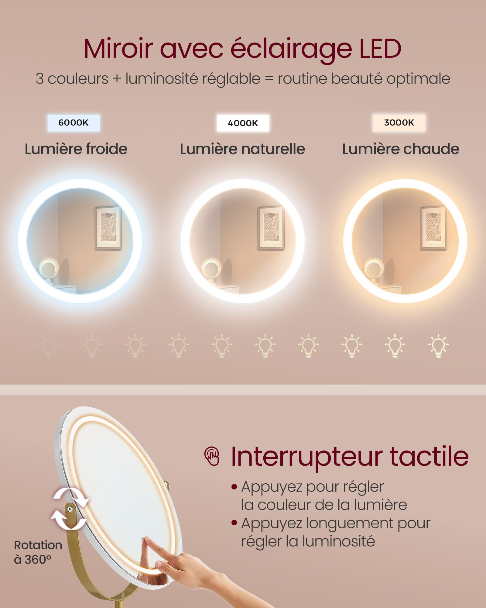 Son miroir pivotant est équipé d’un éclairage réglable, que vous pouvez ajuster en intensité et en couleur grâce à un simple contrôle tactile. Cette fonctionnalité vous garantit un maquillage toujours précis, quelles que soient les conditions de lumière.
