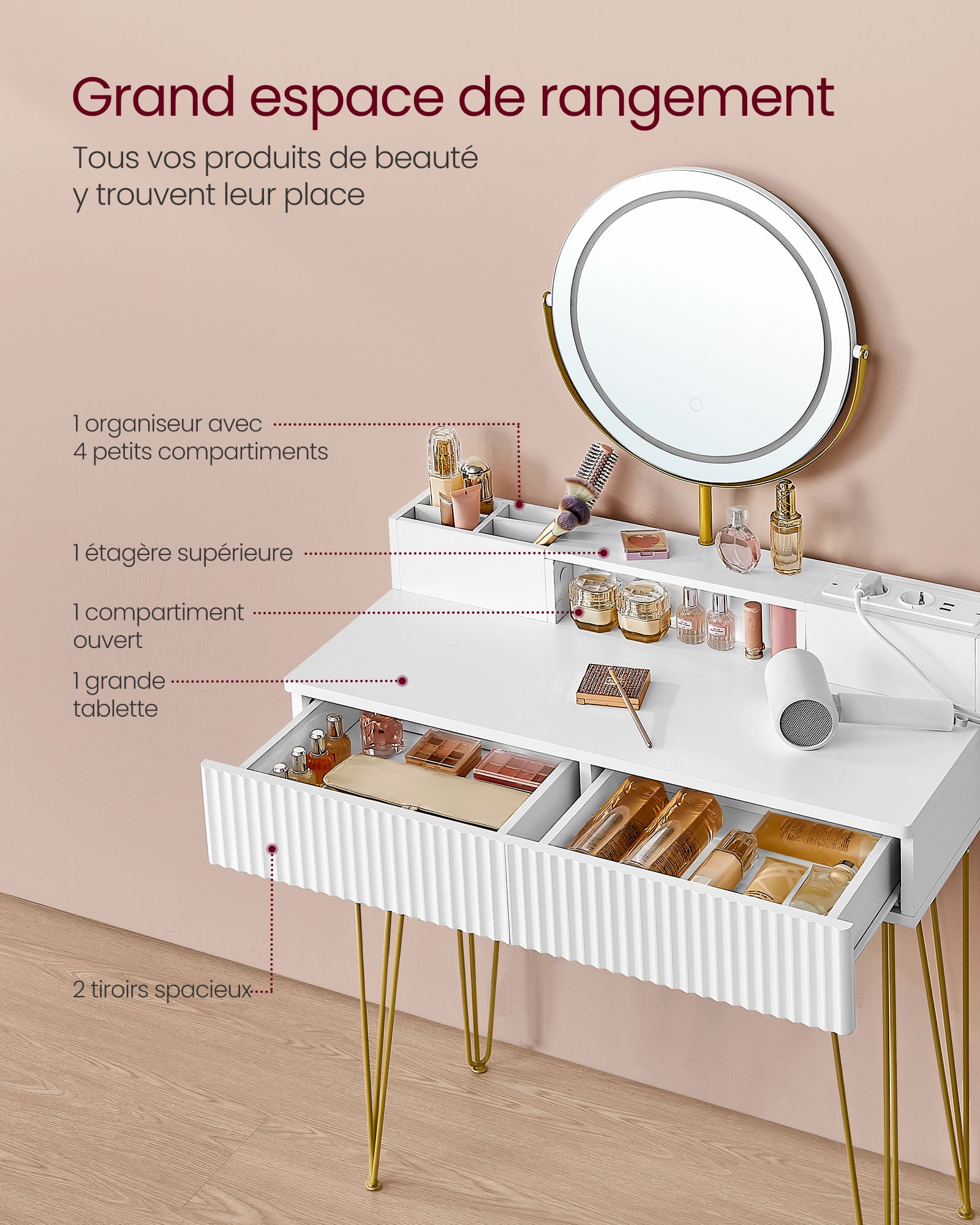 Cette coiffeuse associe praticité et élégance pour répondre à tous vos besoins de rangement et de mise en beauté. Son plateau spacieux s’accompagne de 2 grands tiroirs, d’un organiseur avec 4 petits compartiments et d’un compartiment ouvert, vous permettant de garder vos produits et accessoires soigneusement rangés tout en ayant vos essentiels à portée de main.