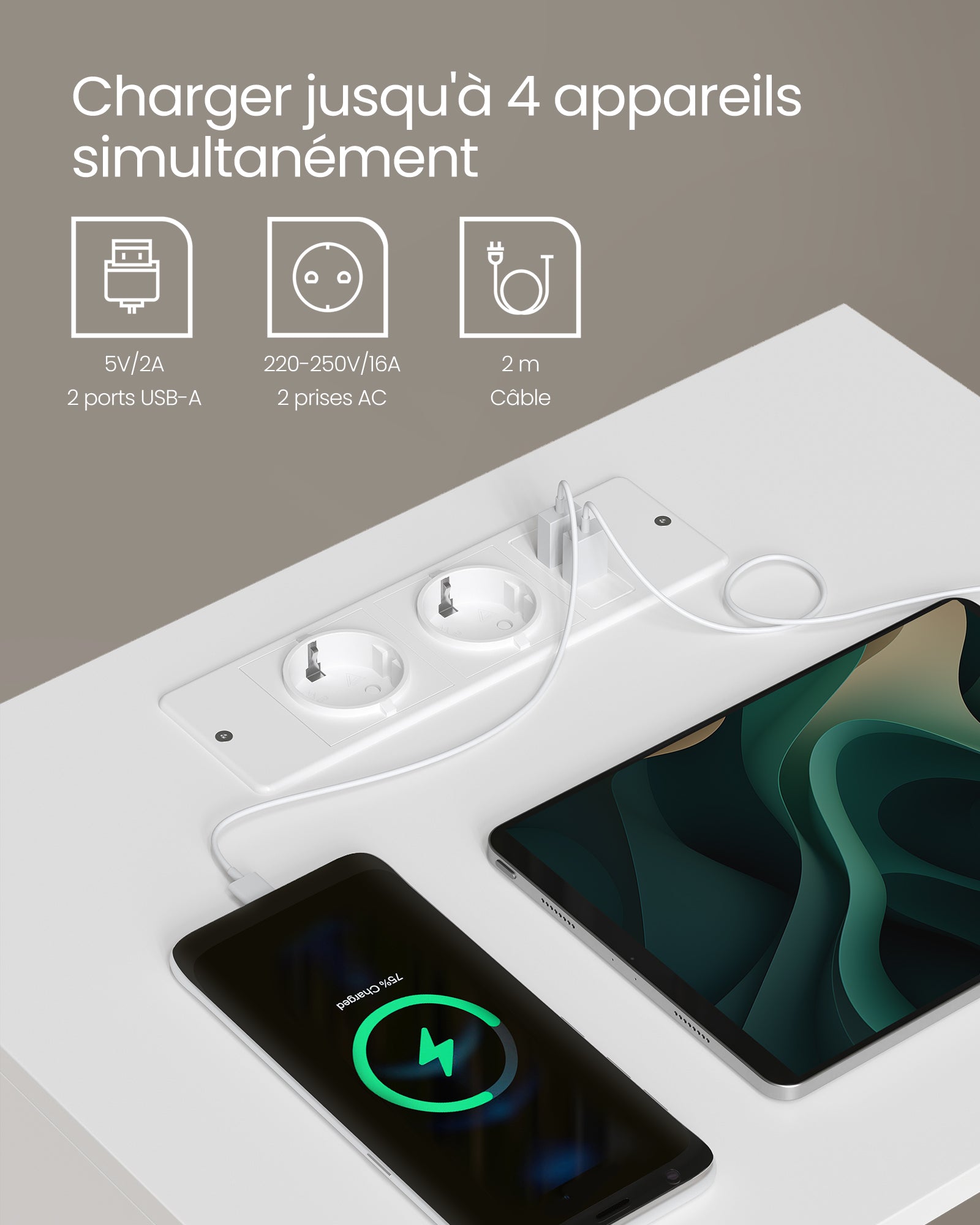 Pratique, elle est équipée d’une multiprise intégrée comprenant 2 ports USB et 2 prises AC. Vous pouvez ainsi recharger votre téléphone, tablette ou casque directement depuis votre lit, sans avoir à chercher une prise murale.