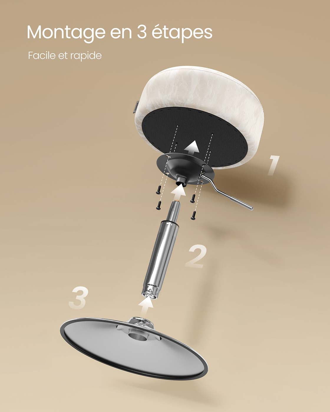 Ces tabourets pivotent à 360° et s’ajustent en hauteur entre 44 cm et 60 cm pour s’adapter à vos besoins. La base circulaire de 38 cm assure une stabilité fiable et sécurisée, même lors de mouvements fréquents.