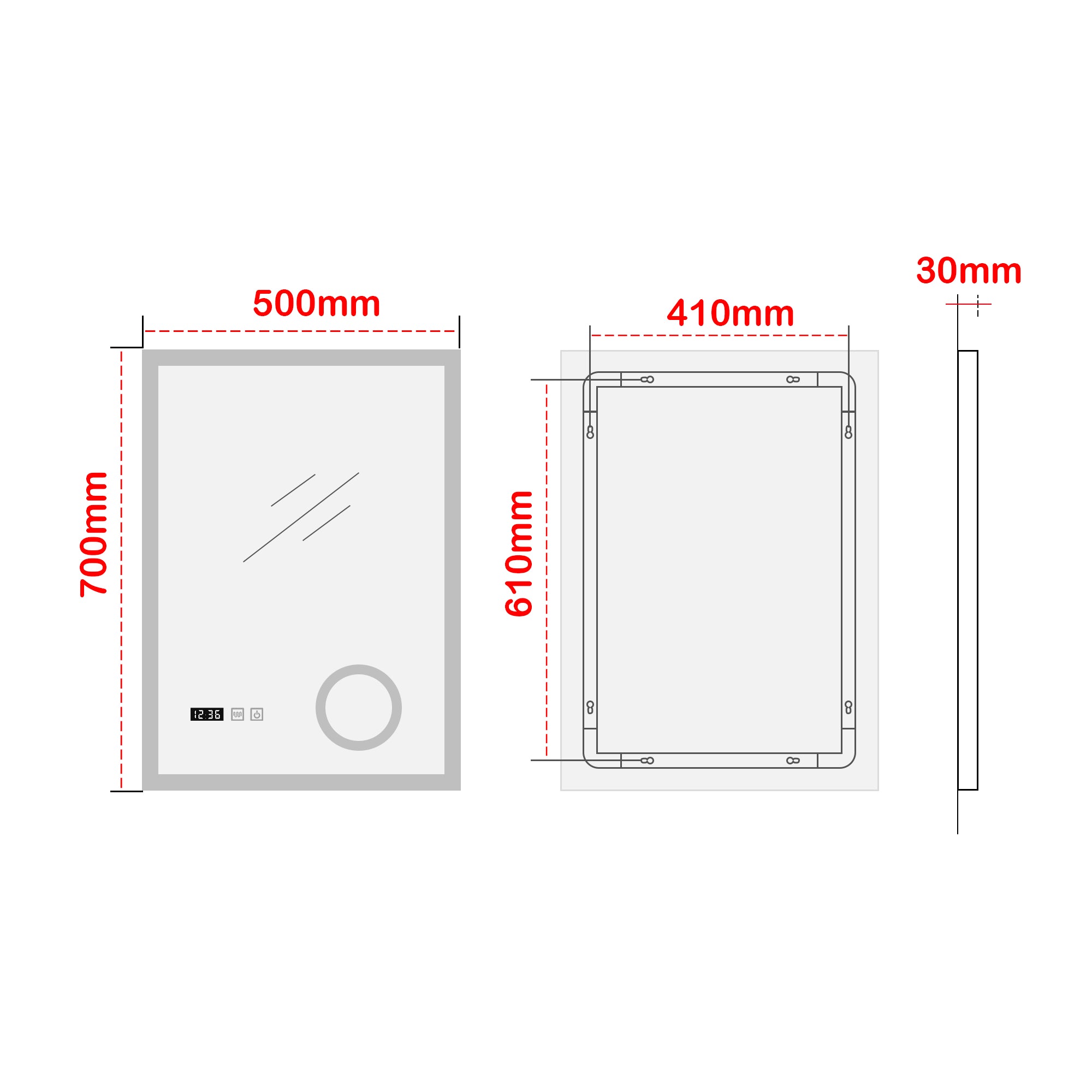 Notre miroir stylé crée une ambiance agréable dans votre salle de bain. Équipé de trois niveaux d'éclairage - blanc chaud (3000 K), blanc neutre (4500 K), blanc froid (6500 K) - il s'adapte parfaitement à vos besoins. Son fonctionnement est très simple, l'interrupteur tactile vous permet de l'allumer et l'éteindre en un rien de temps. Avec 120 perles LED par mètre, sa bande lumineuse (IP65) est de faible consommation d'énergie et possède une durée de vie jusqu'à 50 000 heures. Il est possible de régler le niveau d'éclairage entre 10 % et 100 %, vous pouvez également sauvegarder votre réglage personnel. Son montage est facile, il suffit de brancher le miroir sur une prise, cependant, nous vous recommandons de faire appel à un professionnel pour l'installation. De plus, notre miroir LED est doté d'une fonction anti-buée ainsi que d'un cercle lumineux avec une loupe grossissante 3 fois intégrée.