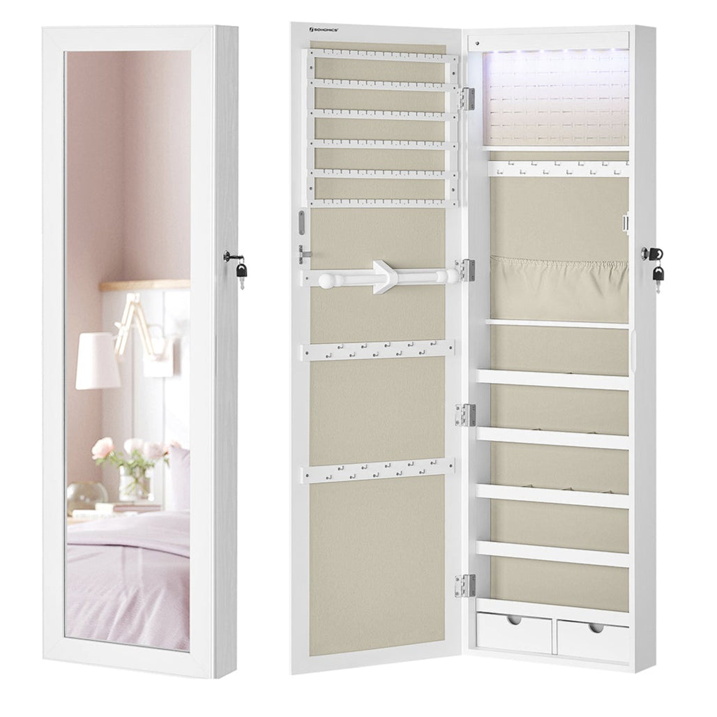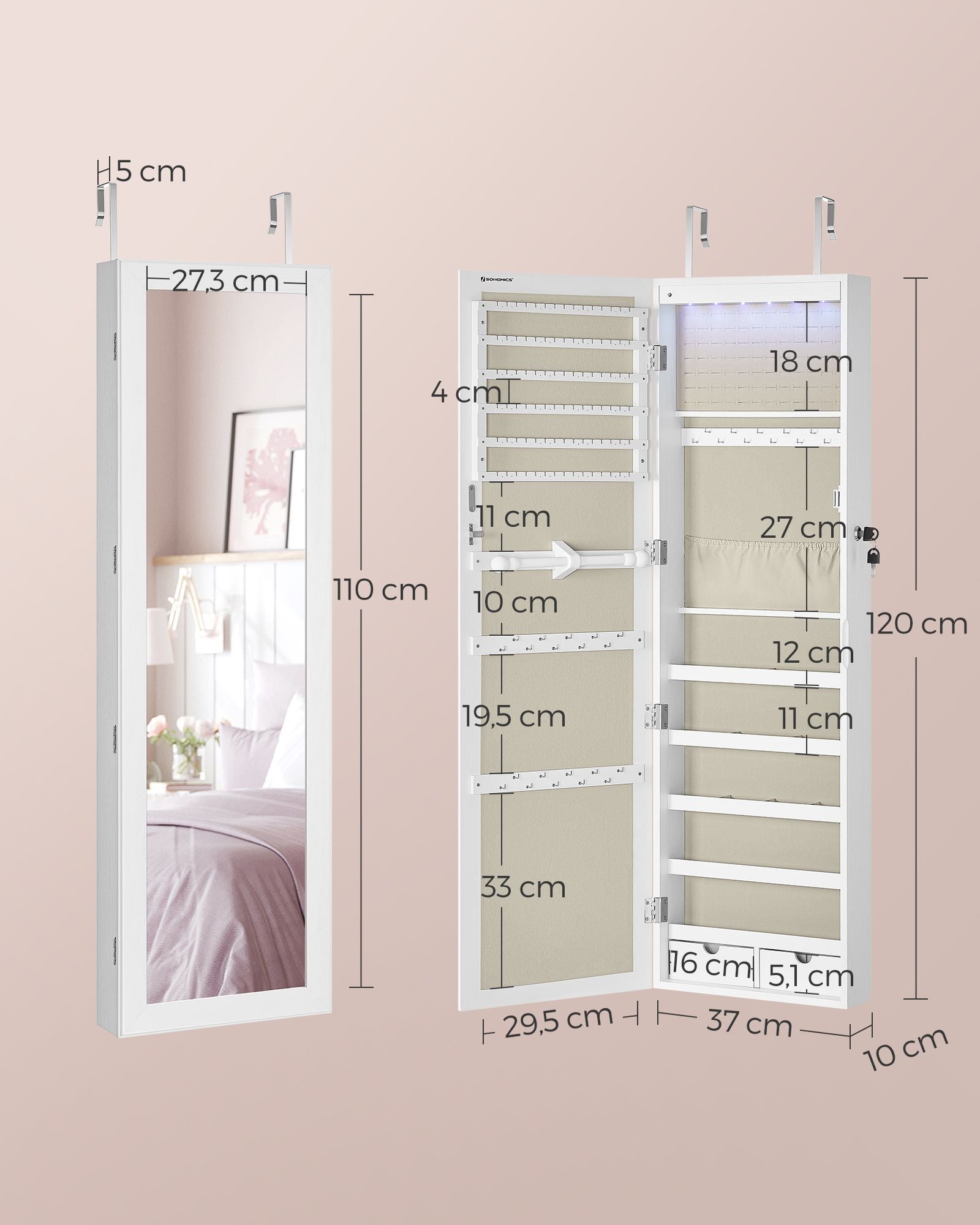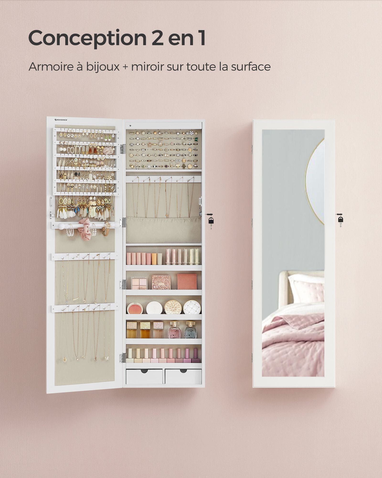 Armoire à bijoux meuble de rangement mural 10 x 37 x 120 cm pour colliers boucles d’oreilles placard à accessoires avec miroir divers compartiments verrouillable blanc 12_0003934