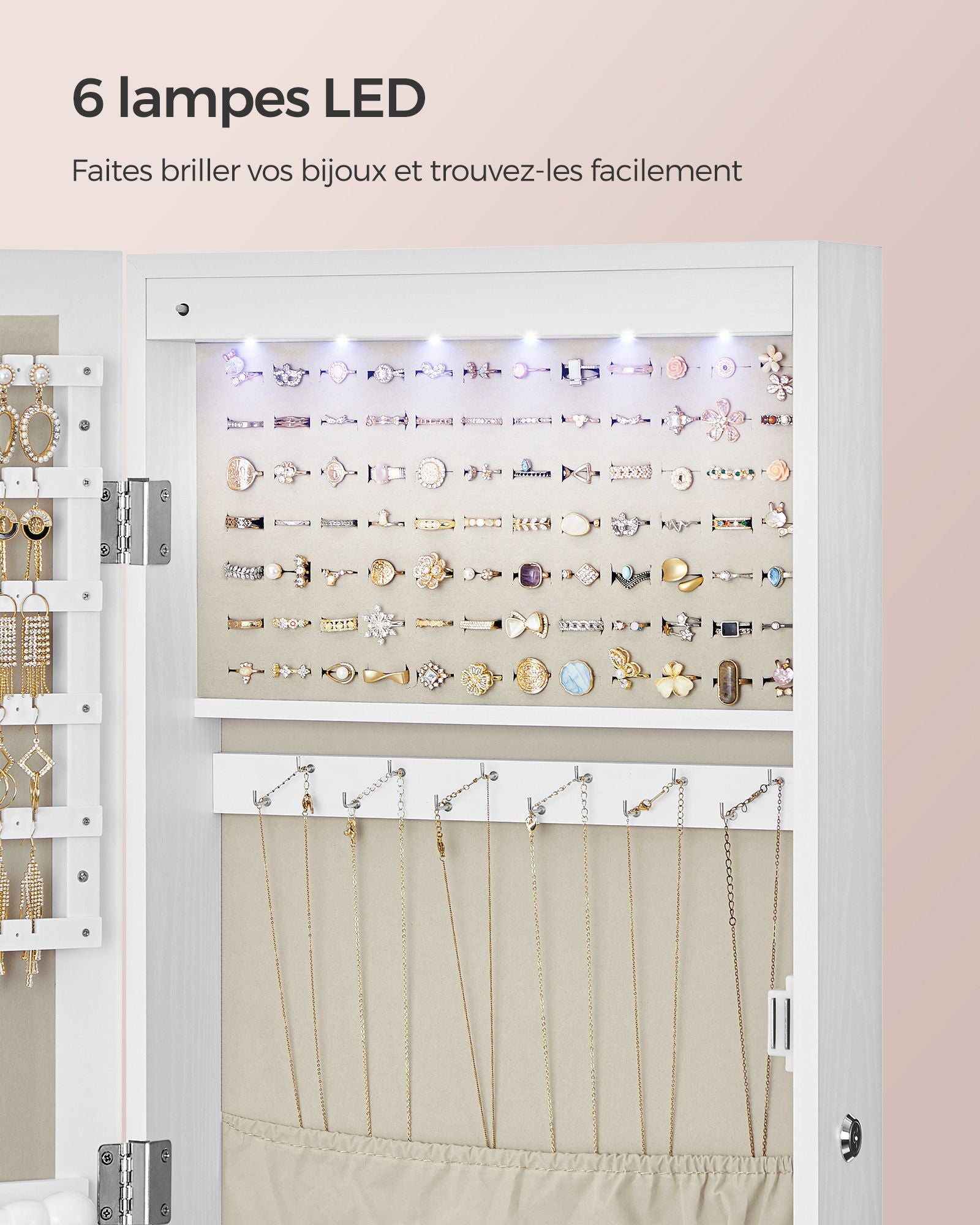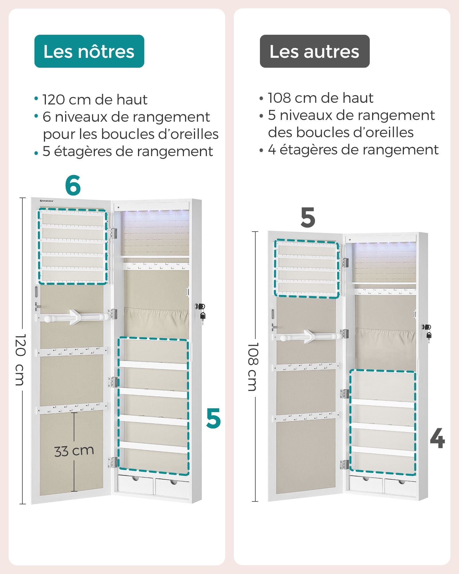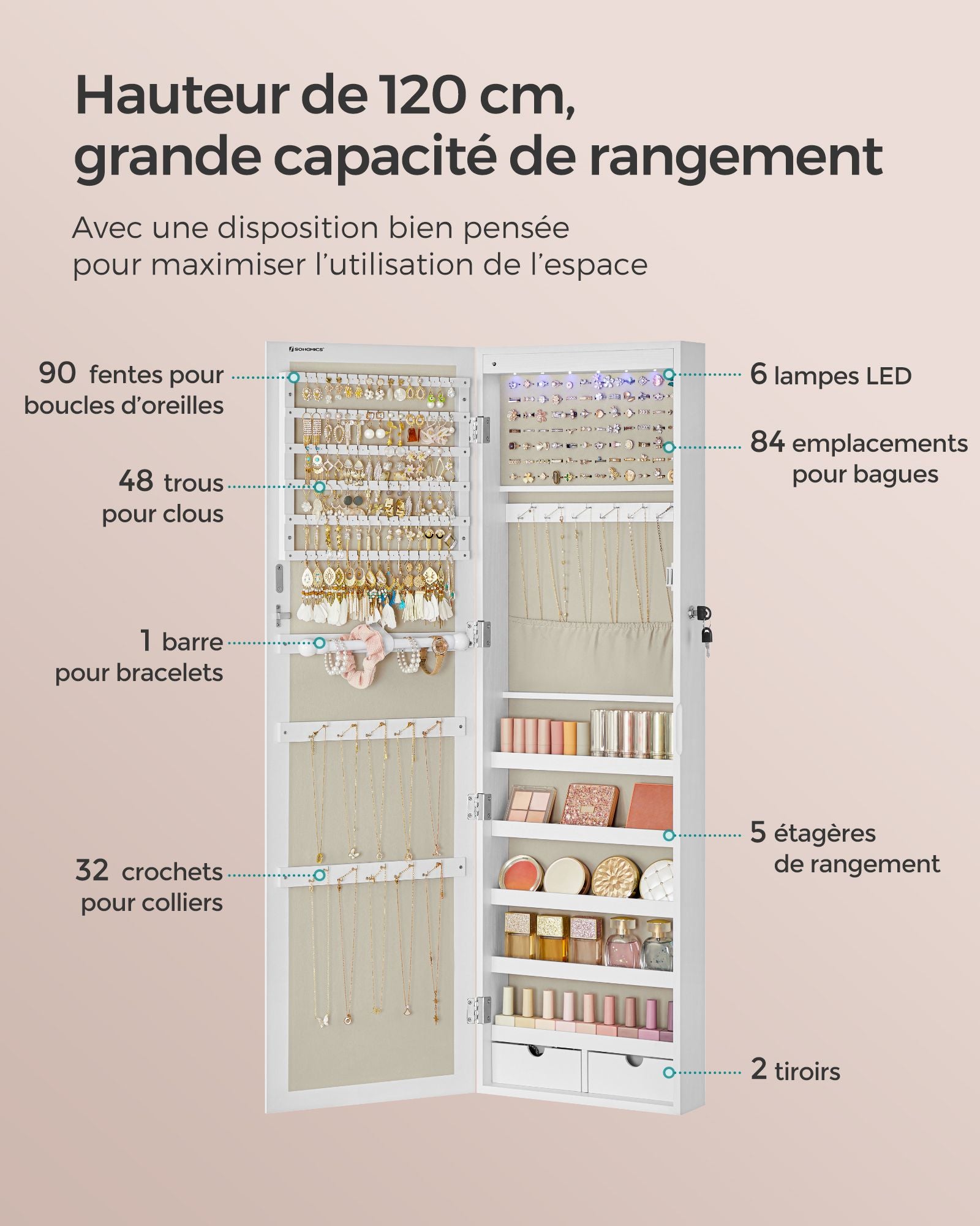 Son espace de rangement est généreux et bien pensé : 84 emplacements pour bagues, 90 fentes pour boucles d’oreilles, 48 trous pour clous, 32 crochets pour colliers, 5 étagères, 2 tiroirs et 1 barre pour bracelets. Chaque bijou trouve ainsi sa place.