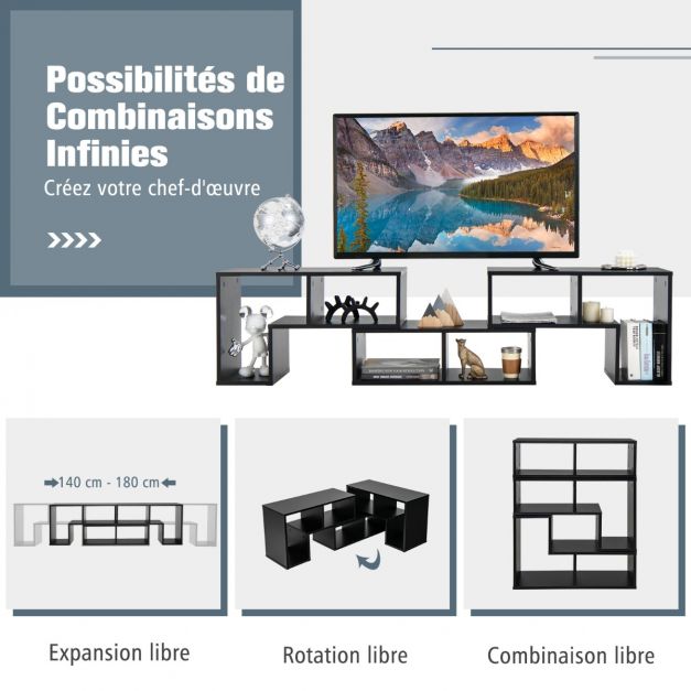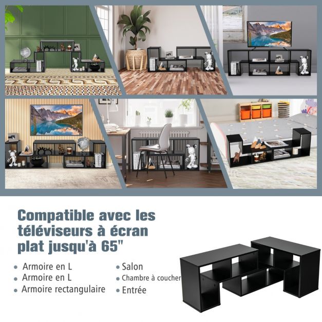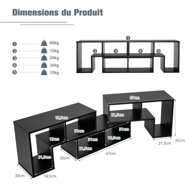 Caractéristiques : 3 pièces peuvent être emboîtées ou empilées de différentes manières et dans différentes formes Le dessus de table extensible de 140 à 180 cm peut accueillir des téléviseurs à écran plat jusqu'à 165,1 cm Les étagères en forme de L empilées sur le rectangle peuvent pivoter pour former un meuble de rangement d'angle Offre une grande capacité de stockage pour garder les livres, les ornements et autres objets divers en ordre Fabriqué à partir de planches épaissies et équipé de patins réglables pour une construction stable Des autocollants sont fournis pour couvrir les trous de vis pour un look propre et bien rangé Peut être utilisé comme meuble TV, meuble de rangement ou présentoir Couleur : Noir Matériau : Bois bien conçu Dimensions hors tout : 134 x 30 x 43 cm (L x l x h) Poids net : 22 kg Capacité de poids du dessus de table : 80 kg Capacité de poids de chaque étagère : 20 kg Livraison : 2 x étagères en forme de L 1 x étagère rectangulaire 1 x notice de montage