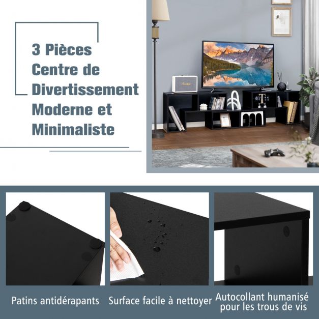 Meuble tv 3 pièces 139x30x43cm combination libre pour télévision jusqu’à 49 pouces pour salon chambre bureau en MDF noir 20_0004949