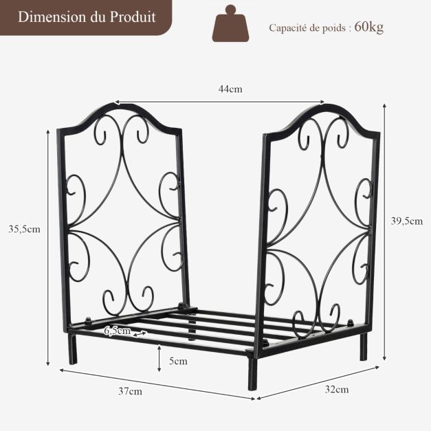 Porte-bûches en fer forgé avec poignée charge max 60 kg de bois range-bûche pour poêle brasero foyer cheminée 44 x 32 x 39,5 cm 20_0005192