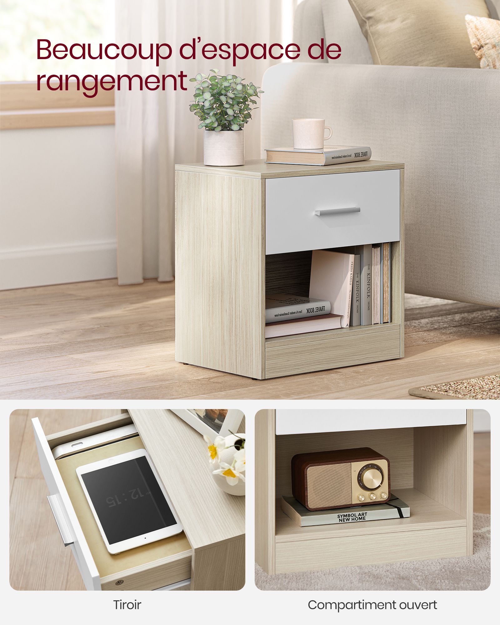 Avec leur design minimaliste et leurs lignes épurées, ces tables de chevet apportent une touche moderne et élégante à votre chambre. Leur style sobre leur permet de s’harmoniser facilement avec tout type de décoration intérieure.