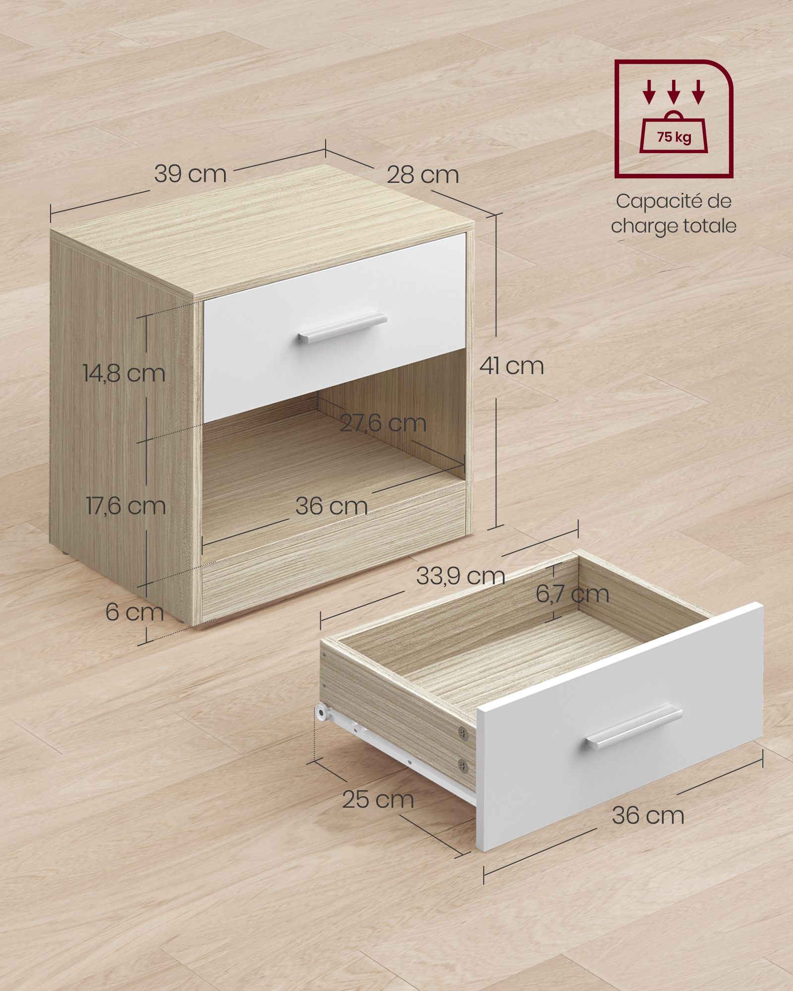 Conçues en panneaux d’aggloméré solides et dotées de ferrures de qualité, ces tables de nuit offrent une excellente stabilité et une grande robustesse. Chaque table peut supporter jusqu’à 75 kg au total, tandis que le tiroir dispose d’une capacité de charge de 5 kg, assurant une utilisation fiable au quotidien.
