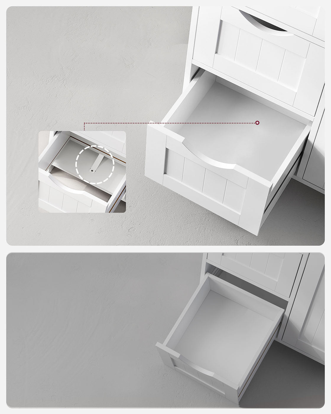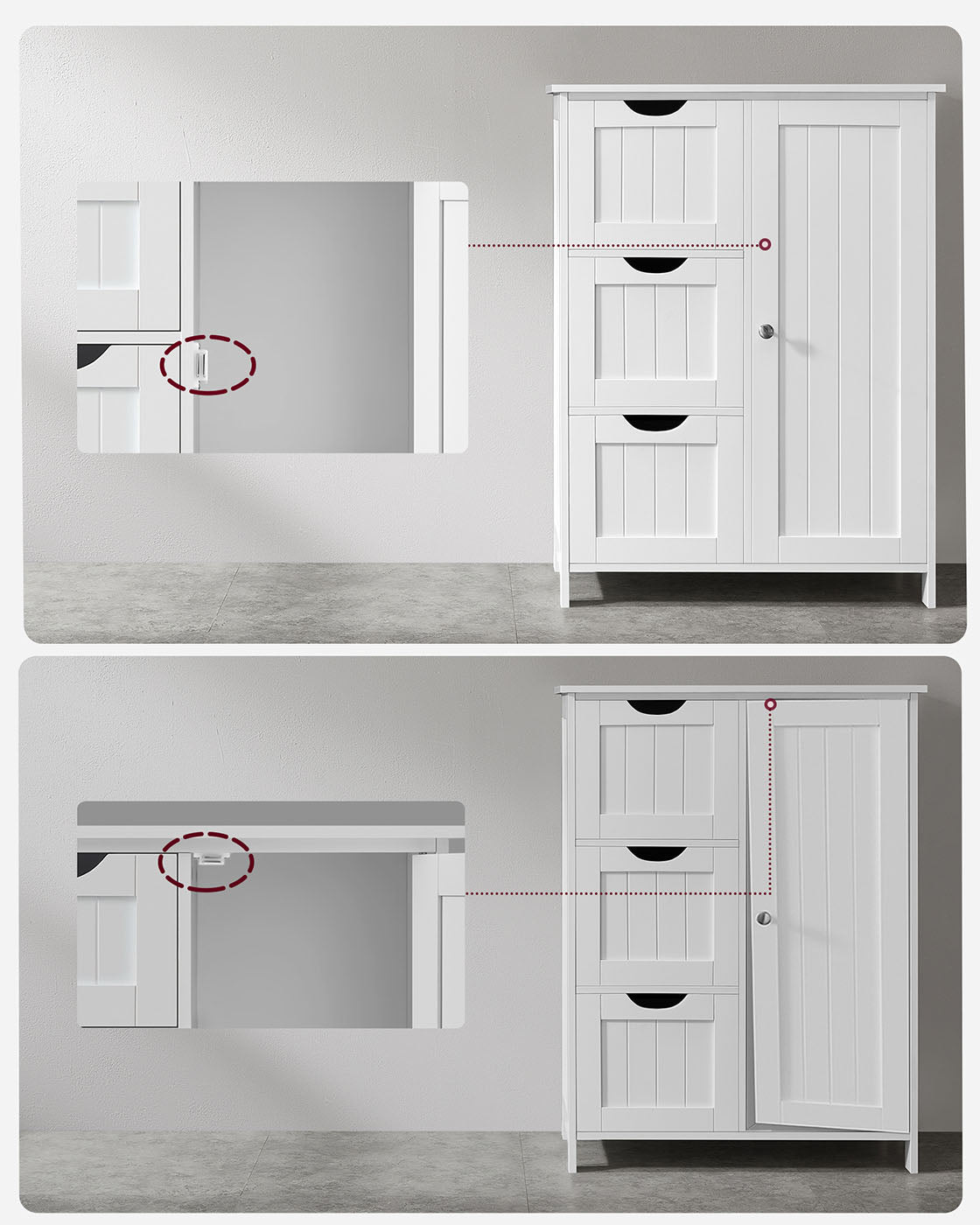 Ses trois grands tiroirs de 26,5 x 26,5 x 22,5 cm offrent un espace idéal pour vos flacons et bouteilles de format familial. À cela s’ajoute un placard avec une planche réglable sur 3 hauteurs, permettant d’adapter le rangement selon vos besoins et d’accueillir des objets de différentes tailles.