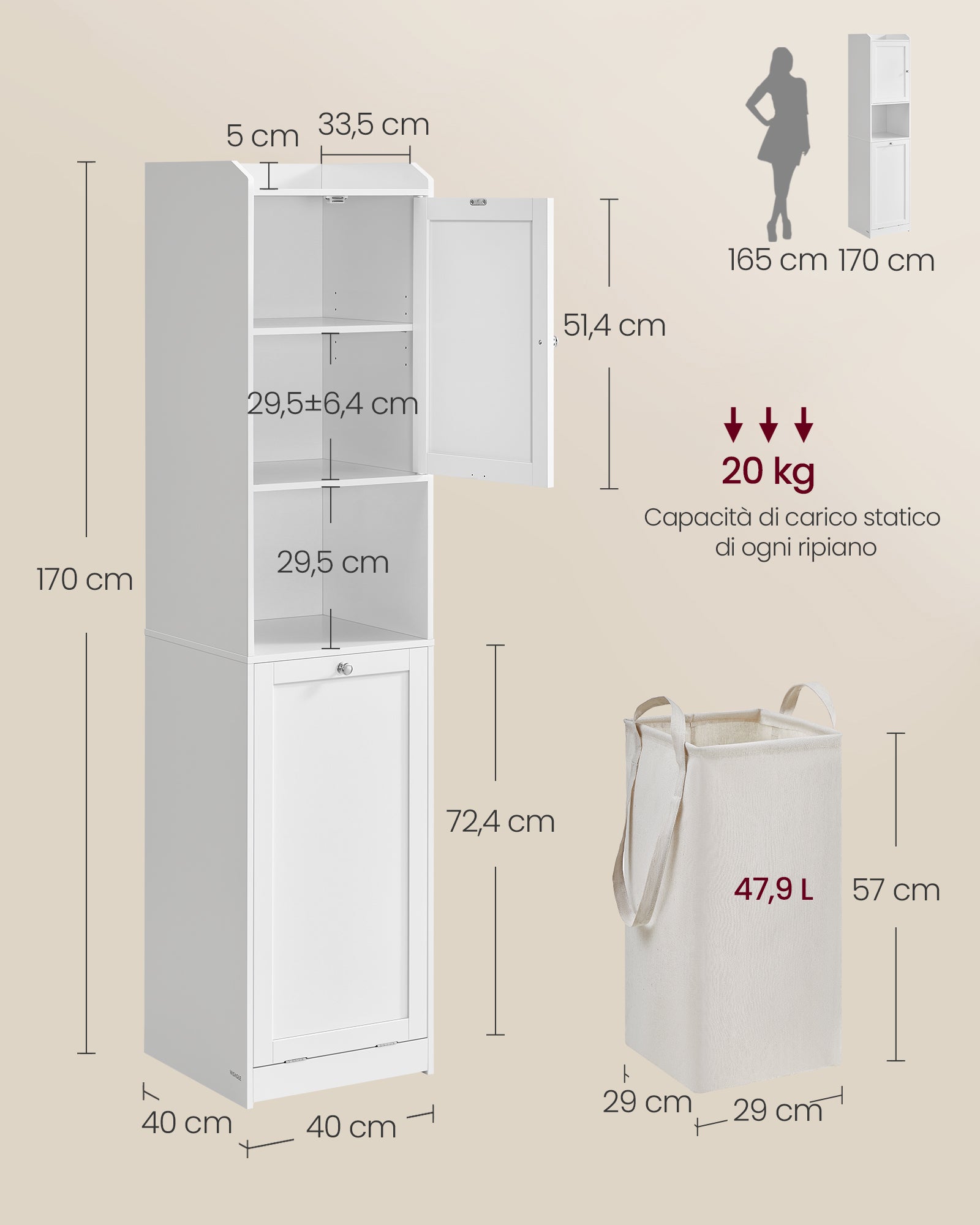 Meuble de salle de bain panier à linge placard de rangement haut sac intérieur amovible avec poignées compartiment avec porte 40 x 40 x 170 cm blanc 12_0006487