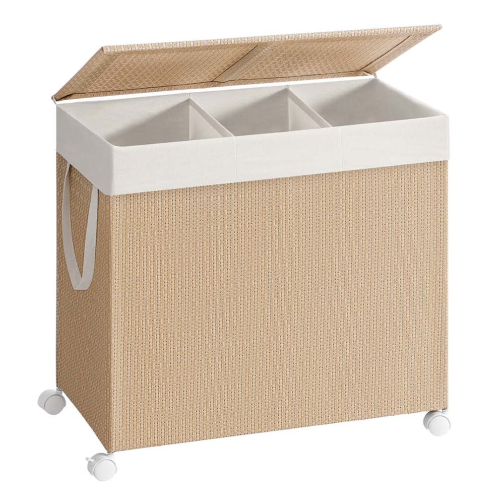 Panier à linge 2 compartiments corbeille 140 litres trieur sur roulettes couvercle sac avec poignées imitation osier pour buanderie salle de bain beige 12_0006081