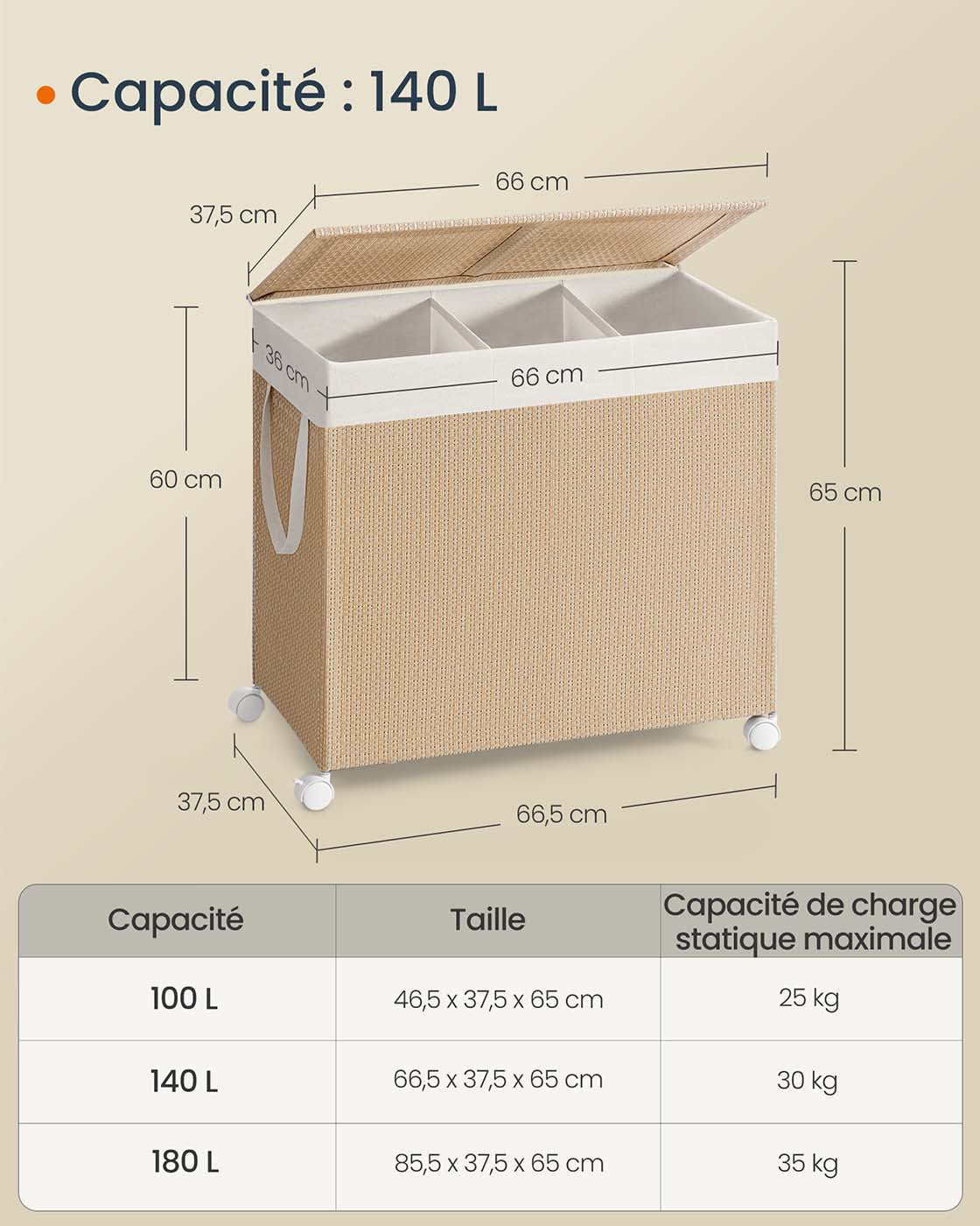 D’une capacité généreuse de 140 litres, il dispose de 3 compartiments pratiques pour trier le linge par couleur ou par type, ce qui simplifie la préparation des lessives pour toute la famille. Son couvercle protège le contenu de la poussière et préserve discrètement votre linge sale.