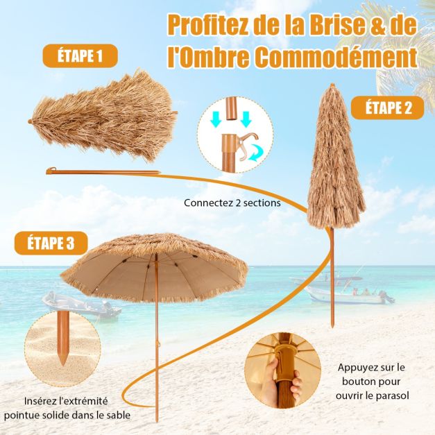 Parasol de plage en chaume PP 7 couches 243 cm de style hawaïen parasol tropical portable 8 baleines en métal bouton-pression imperméable pour cour bord de piscine 20_0008993