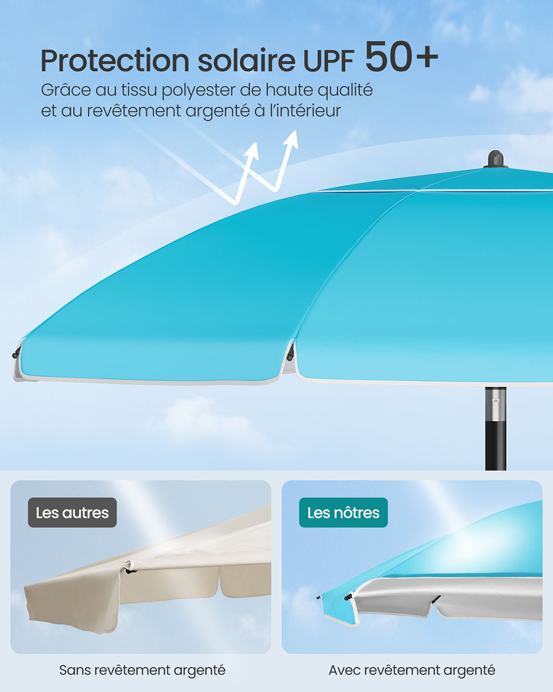 Parasol upf 50+ inclinaison de 30° des 2 côtés hauteur réglable petite tablette crochets adapté pour plage jardin sans base 12_0006893