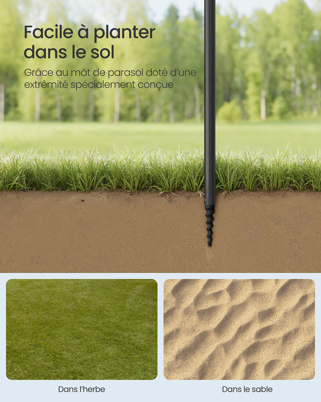 Son installation est simple et rapide : l’extrémité du mât est spécialement conçue pour être enfoncée et tournée facilement dans le sable ou la terre, assurant une fixation stable et sécurisée.