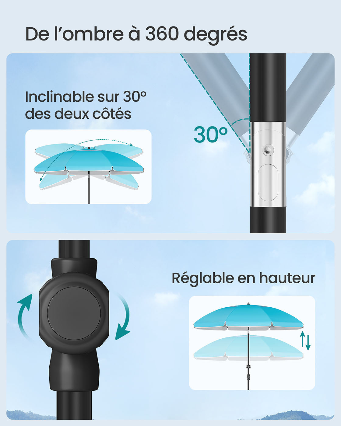 La hauteur est réglable entre 158 et 206 cm et l’inclinaison peut être ajustée jusqu’à 30° de chaque côté, vous permettant de profiter d’une protection personnalisée selon la position du soleil.