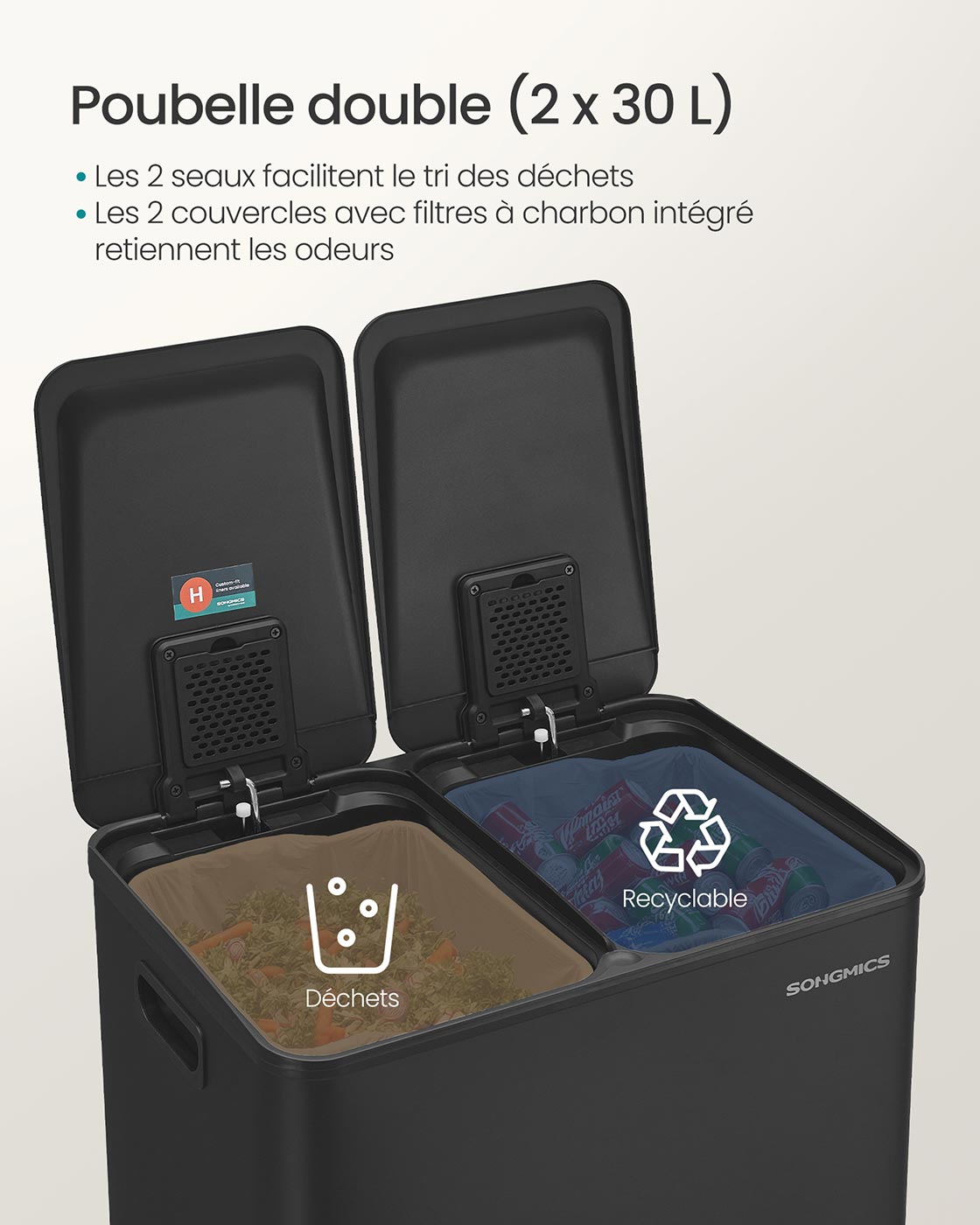 Avec ses 2 compartiments de 30 litres chacun, elle offre une grande capacité de tri. Elle est livrée avec 15 sacs et compatible de 30 L (code H), pour un usage encore plus pratique.