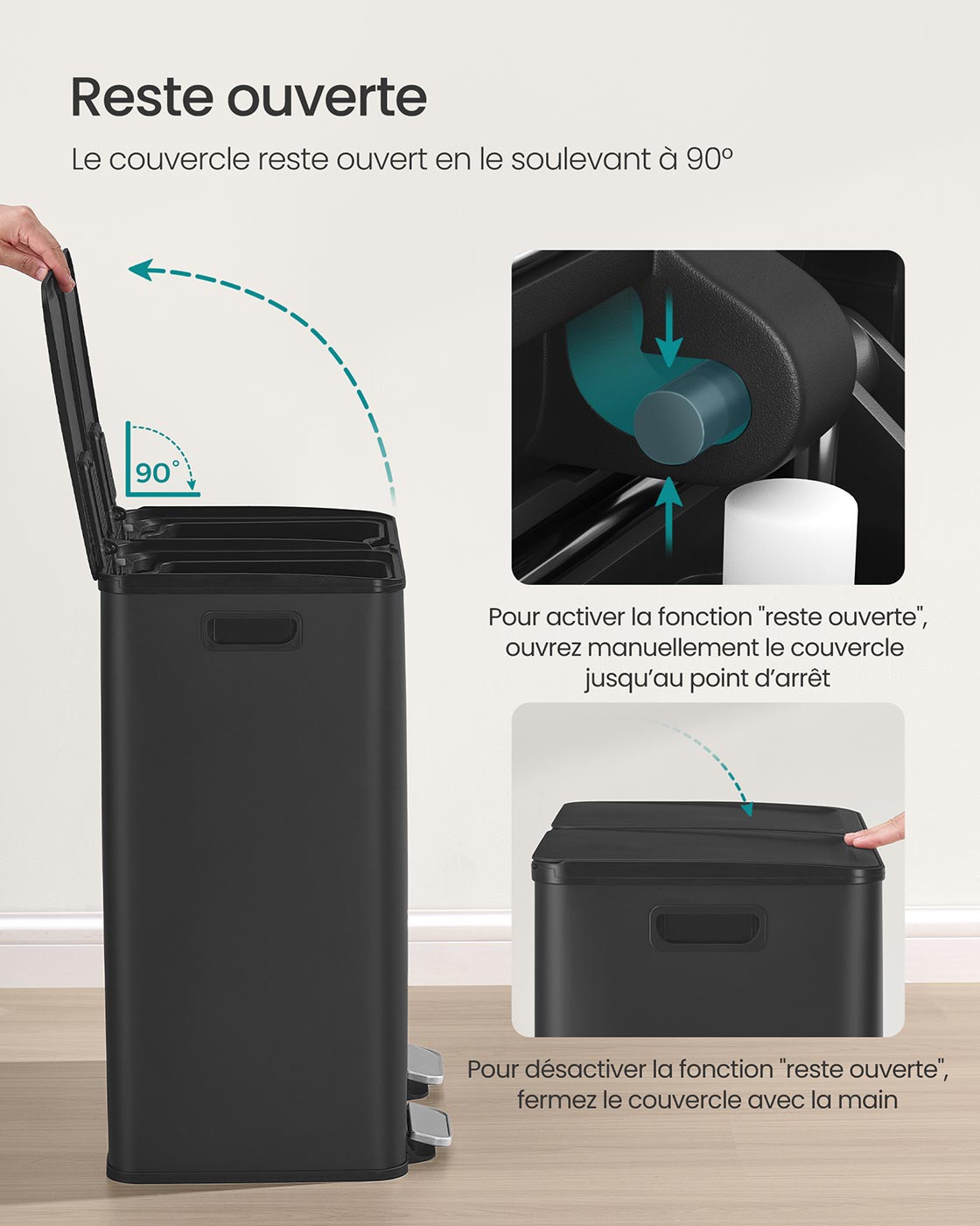 Dotée de 2 pédales, elle permet d’ouvrir chaque compartiment sans effort et sans utiliser les mains. Pour garder le couvercle ouvert, il suffit d’appuyer sur la pédale, de relâcher, puis de soulever le couvercle manuellement jusqu’à 90°.