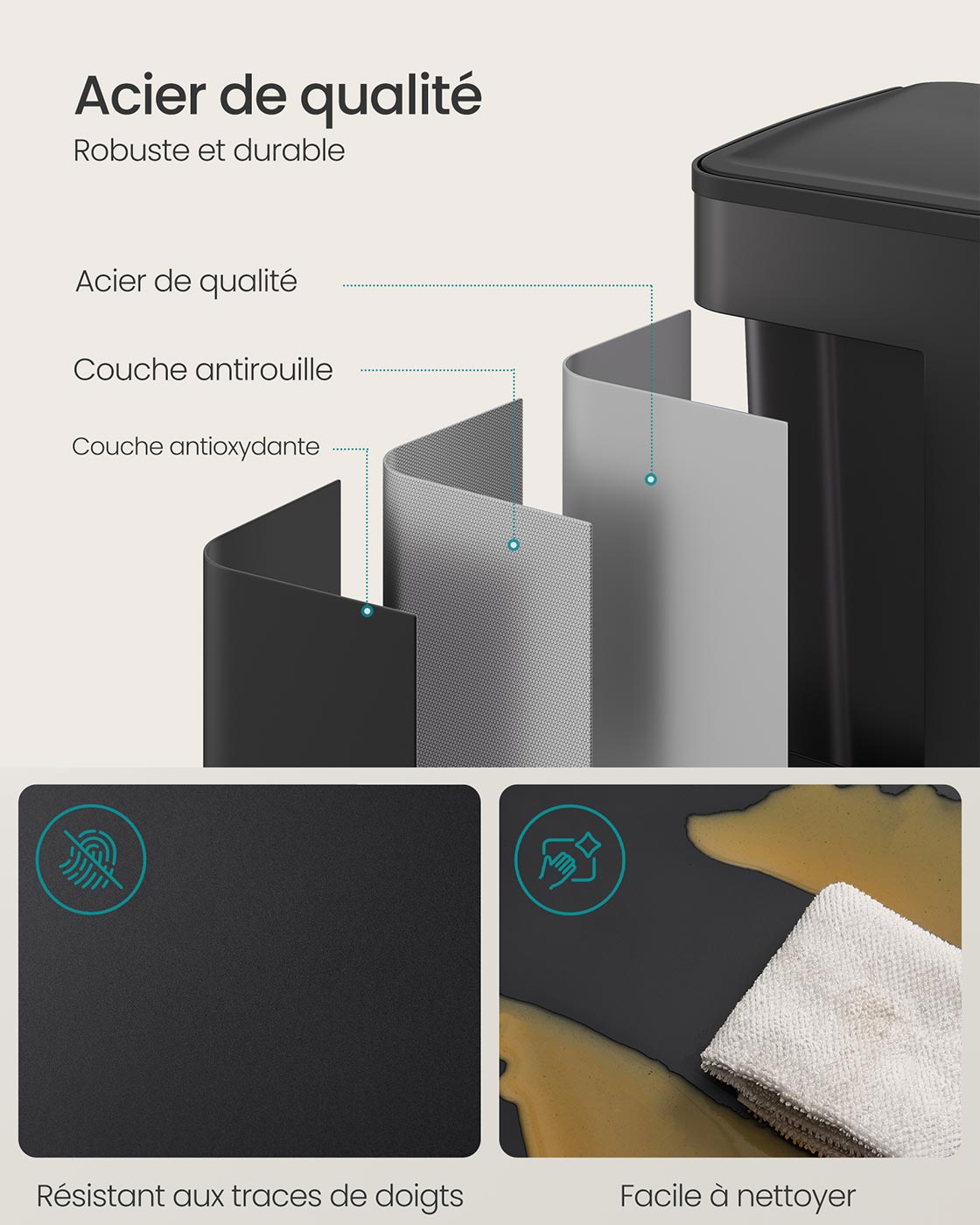 Fabriquée en acier de qualité, cette poubelle est robuste et durable. Son couvercle se referme doucement, sans bruit gênant, pour plus de confort au quotidien.