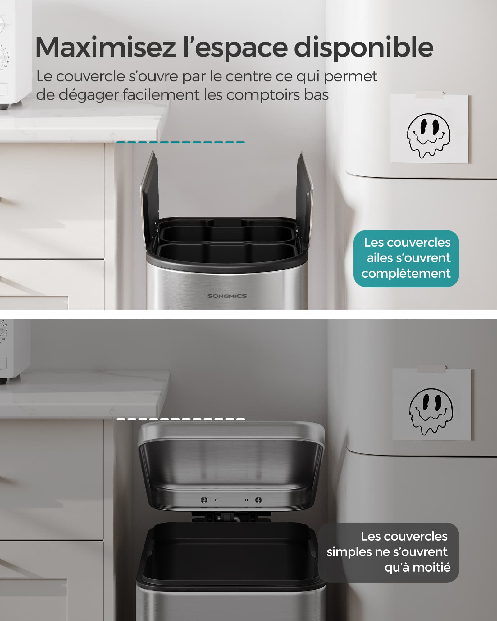 Les couvercles à ouverture par le centre libèrent davantage de hauteur, ce qui évite de heurter les plans de travail bas et optimise l’espace disponible. Les coins arrondis des seaux empêchent les sacs de se déchirer au moment de les retirer.