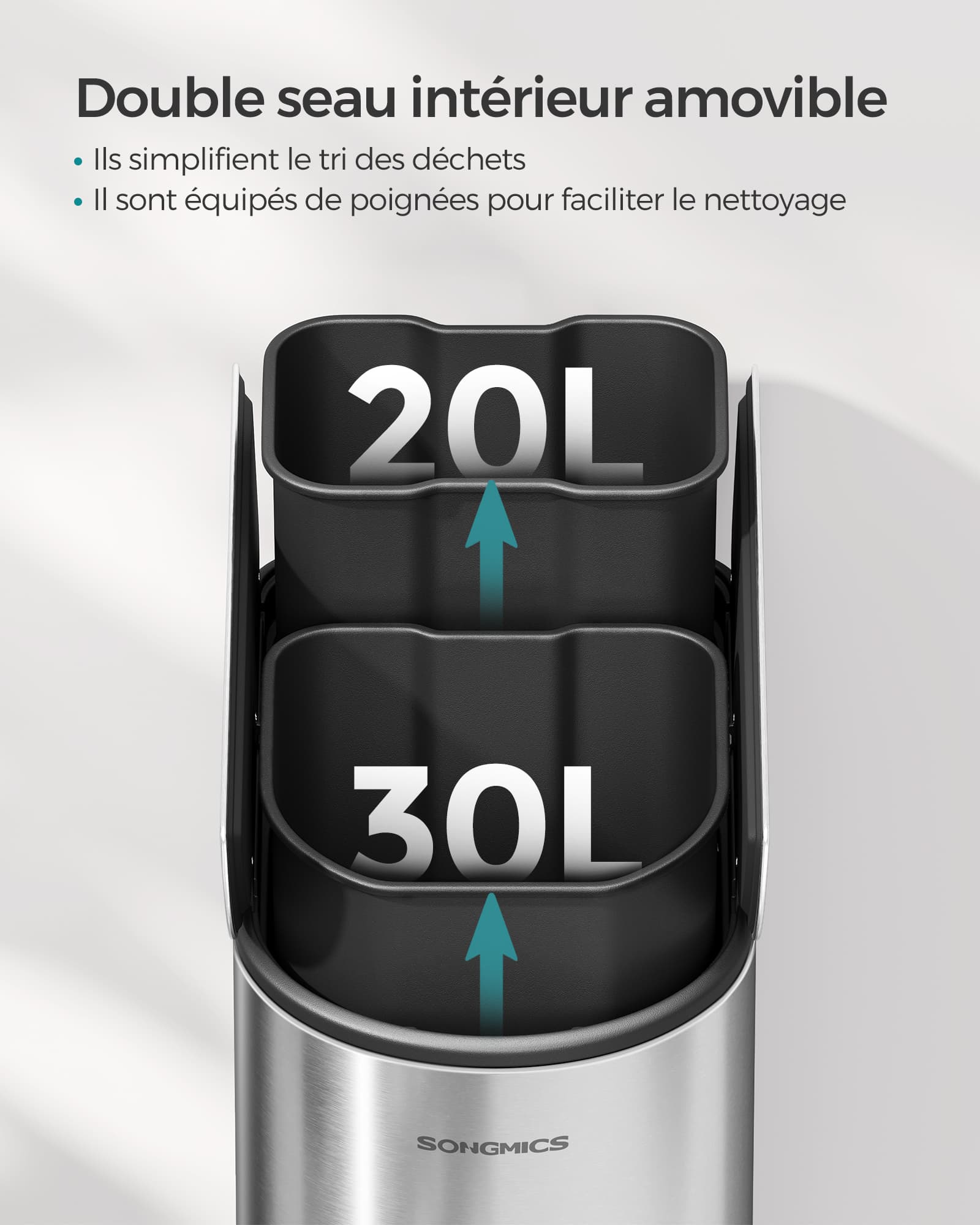 Chaque compartiment est équipé d’un seau intérieur amovible, doté de poignées pratiques. Cela facilite non seulement le nettoyage, mais aussi le remplacement des sacs, qui restent bien maintenus et hors de vue.