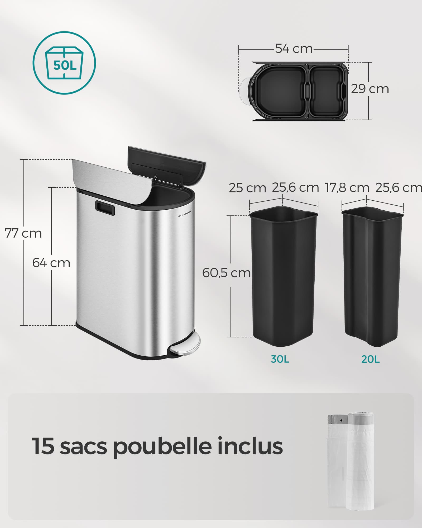 Dimensions de la poubelle (avec pédale) : 54 x 29 x 64 cm (L x l x H)
