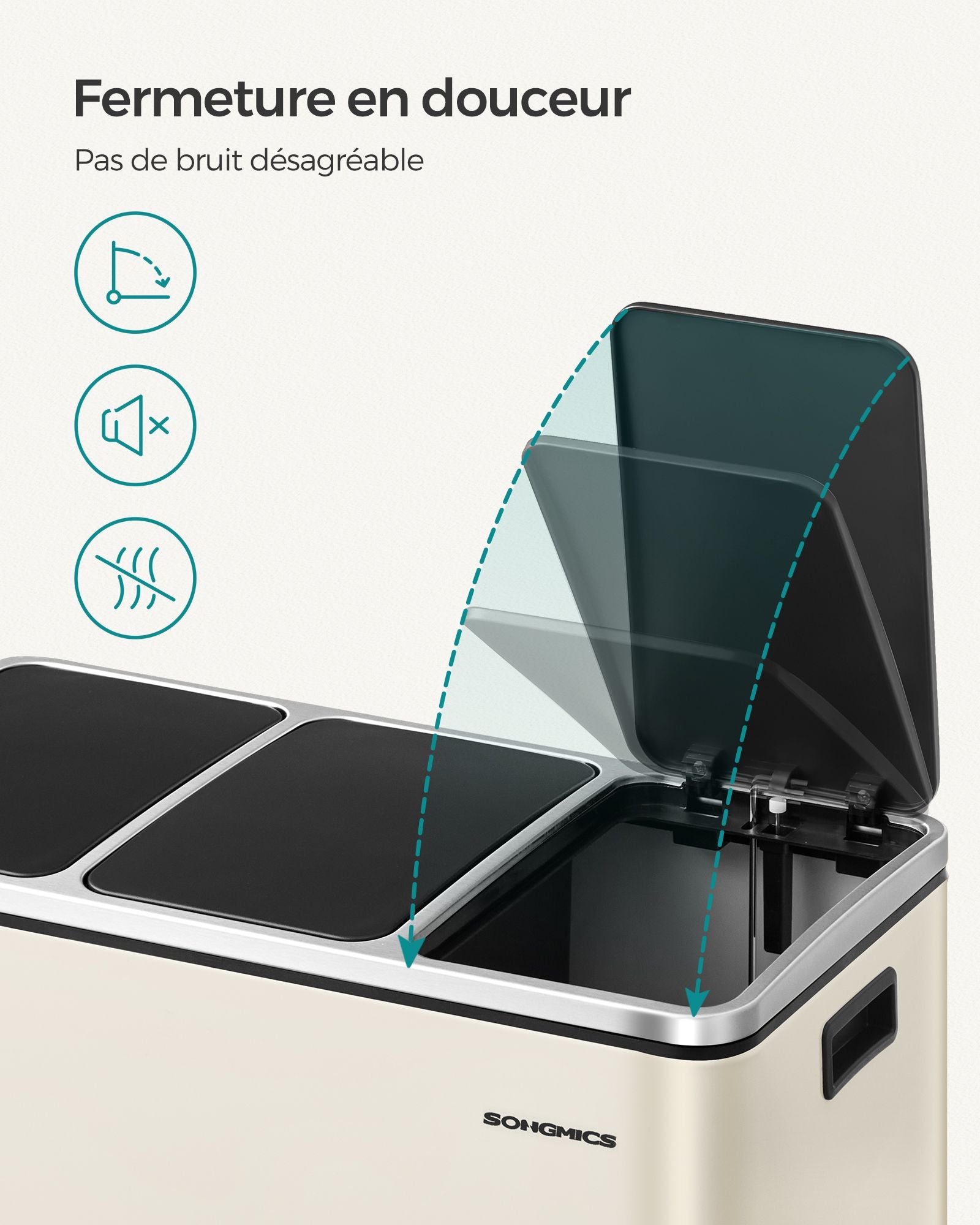 Cette poubelle de cuisine est équipée de trois compartiments de 18 litres chacun, ce qui permet de trier facilement vos déchets au quotidien : recyclables, non recyclables et compost trouvent chacun leur place. Pratique et fonctionnelle, elle facilite le respect du tri sélectif directement dans la cuisine.