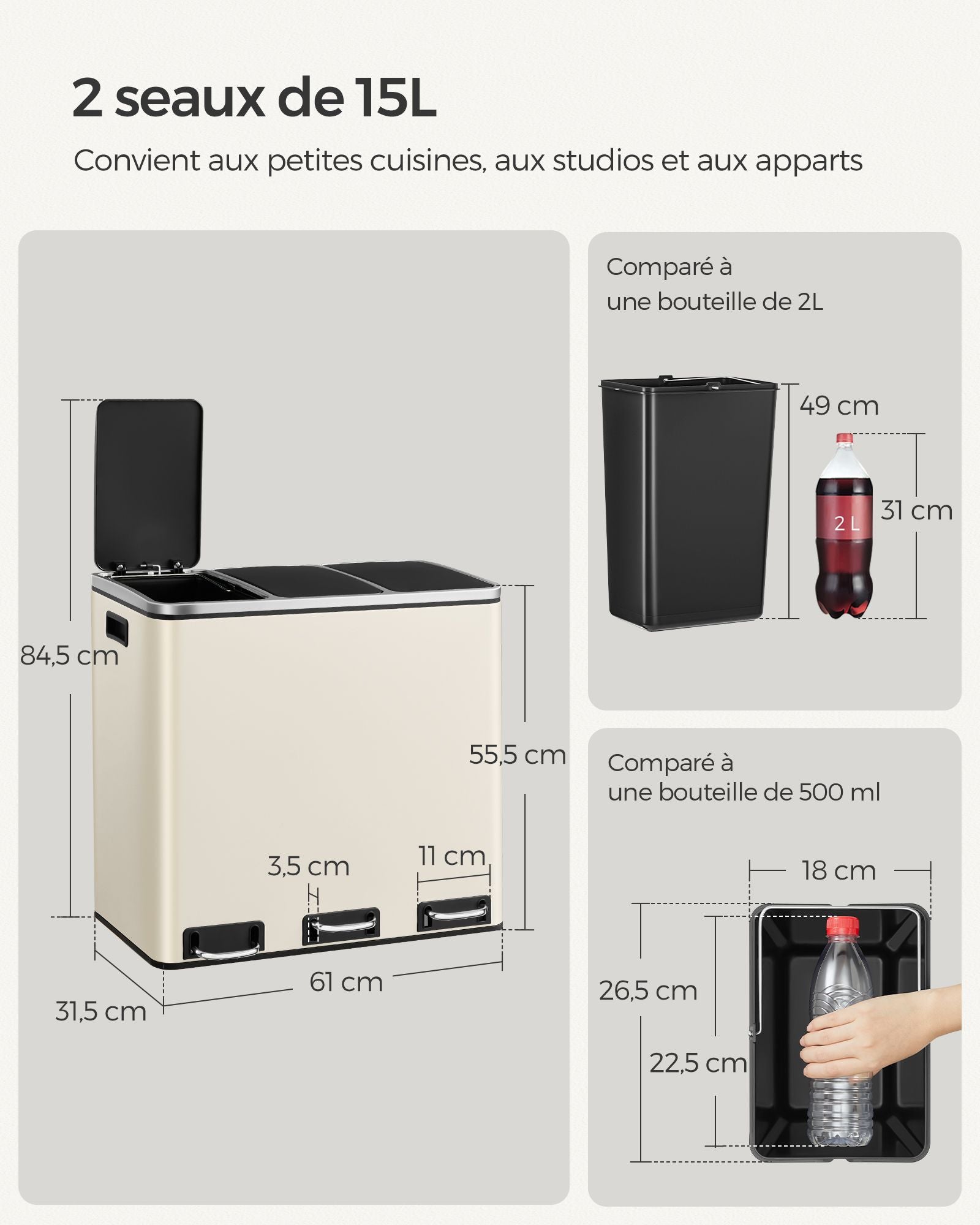 Dimensions de chaque seau intérieur : 18 x 26,5 x 49 cm (L x l x H)