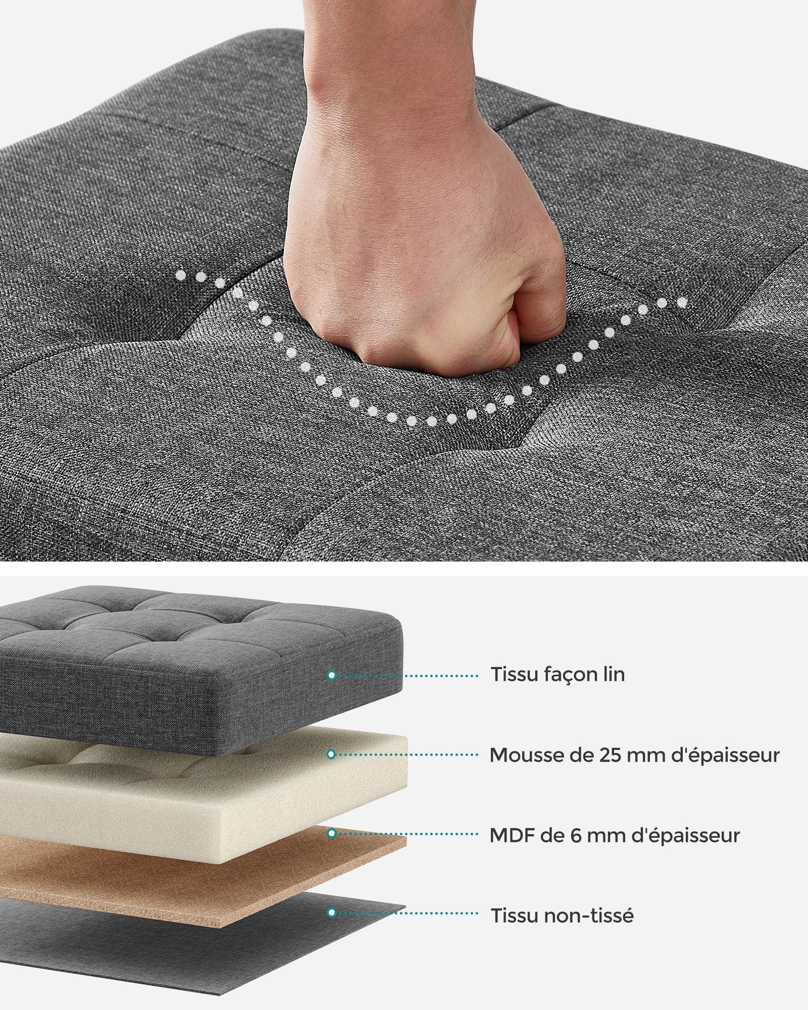 Matériaux : Panneau MDF, rembourrage en mousse, tissu façon lin