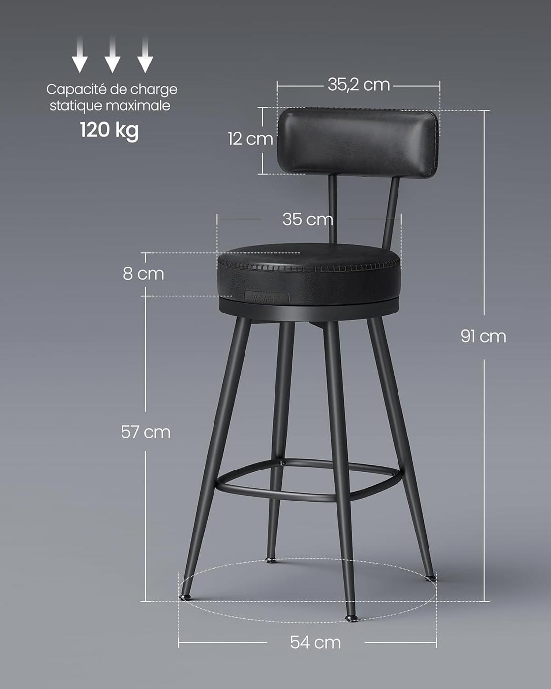 Dimensions de chaque tabouret : 54 x 54 x 91 cm (P x L x H)