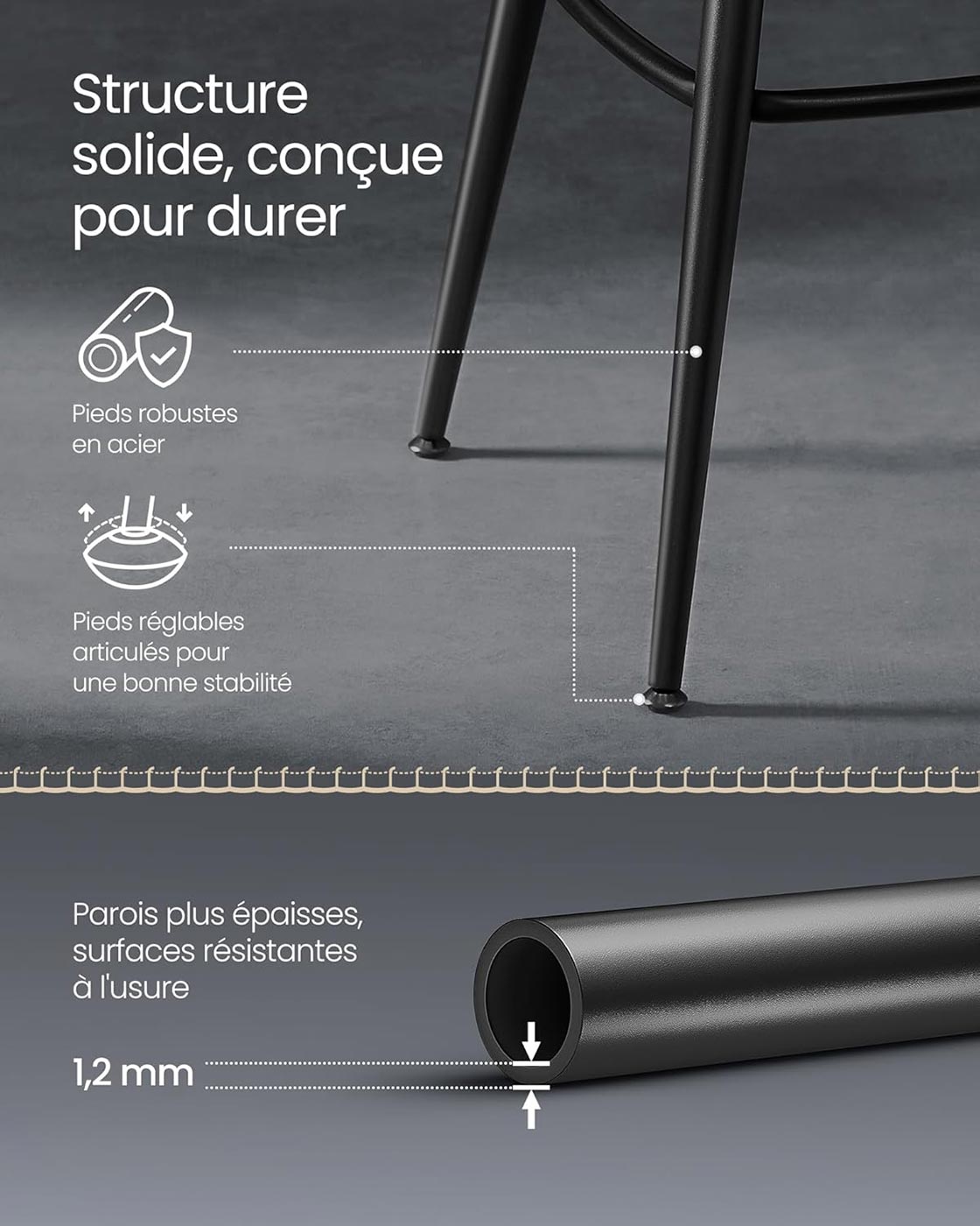 Conçus pour la stabilité, ces tabourets reposent sur des pieds métalliques décalés, équipés de patins réglables articulés qui assurent une assise bien stable même sur sols irréguliers, tout en protégeant vos surfaces des rayures.