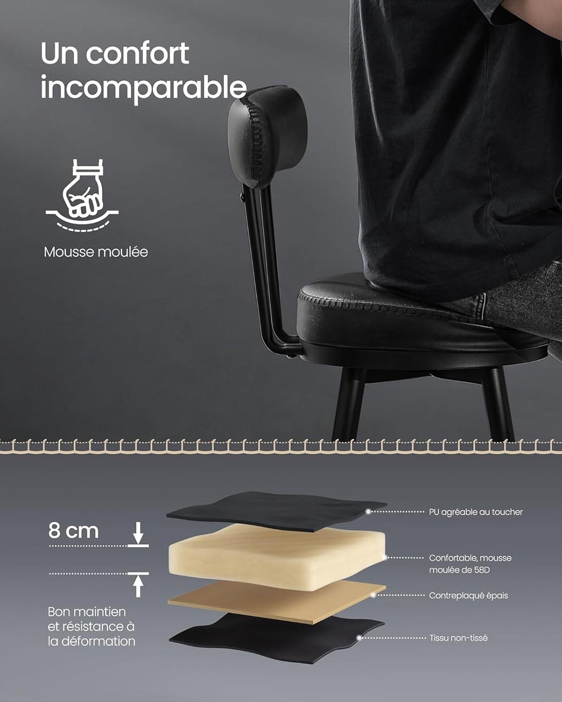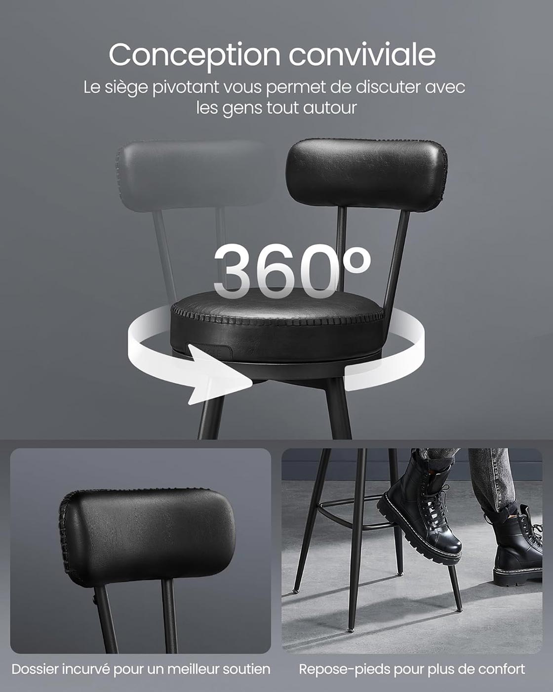 La fonction pivotante à 360° ajoute une liberté de mouvement appréciable, idéale pour discuter et partager un moment convivial autour d’un bar, d’un îlot de cuisine ou dans une salle de divertissement. Leur format compact permet aussi de les glisser facilement sous une table pour gagner de la place.