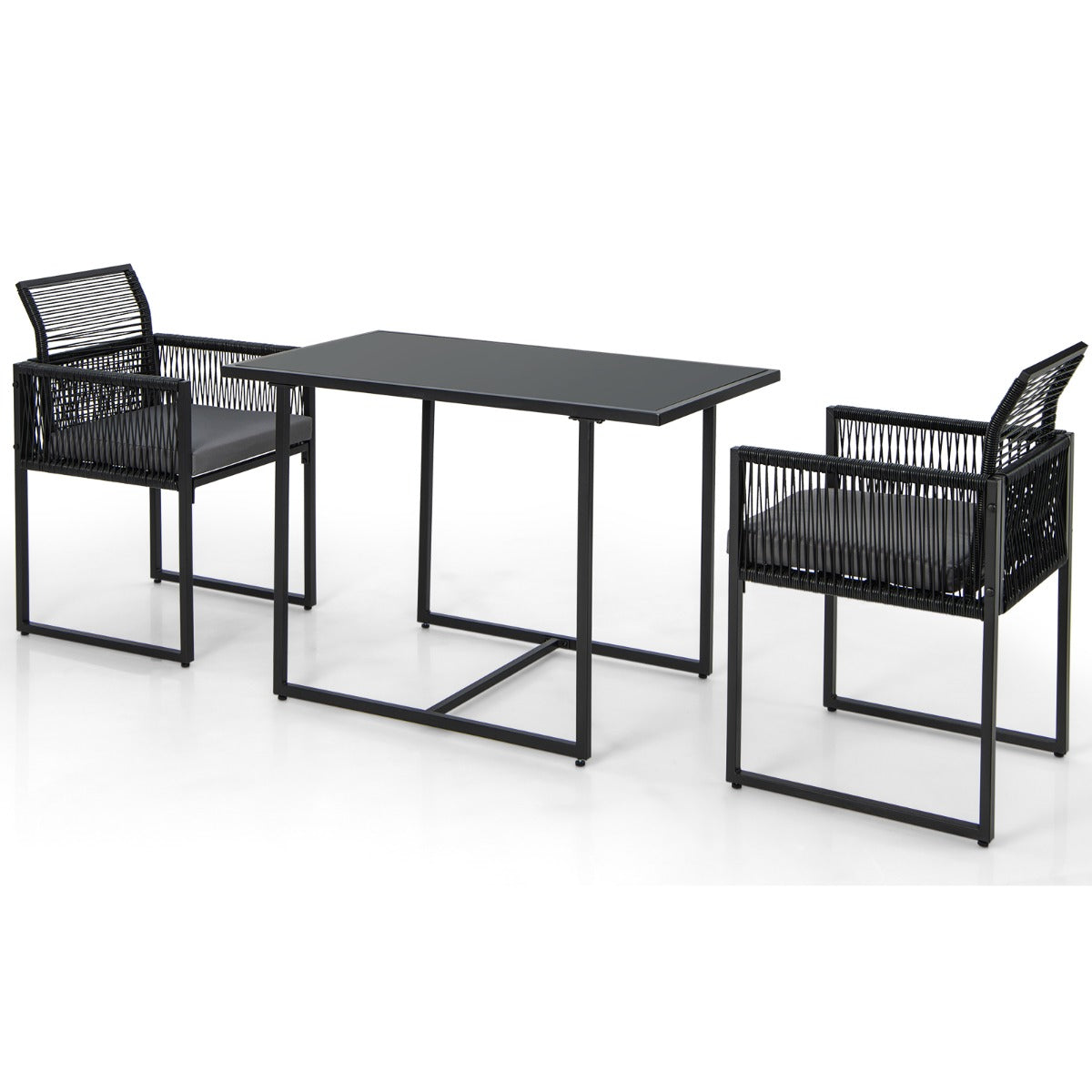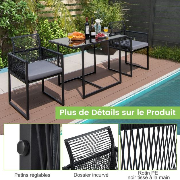 Salon de jardin 3 pièces rotin pe anti soleil dossier amovible plateau en verre trempé cadre en métal style urbain gris 20_0009205