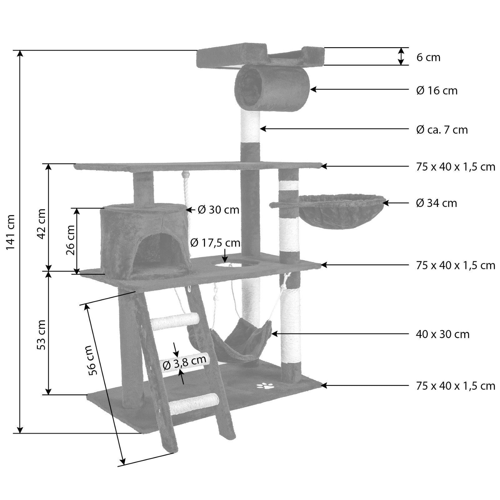 Ce beau griffoir très pratique plaira beaucoup à votre chat. L'arbre à chat offre de nombreuses possibilités pour jouer, se faire les griffes ou se cacher. En grimpant sur l'échelle, votre chat pourra atteindre la niche du premier étage. Juste à côté de la niche, il y a une corde de jeu. Toujours au premier étage, un trou permet d'accéder à un confortable hamac. La nacelle juste un peu plus haut est parfaite pour se prélasser. Le spacieux deuxième étage, où votre chat pourra s'étirer à son aise, mène à un tunnel surmonté d'une plateforme d'observation se trouvant à une hauteur de 141 cm. De là-haut, le chat pourra observer tranquillement tout ce qui se passe dans la pièce. Sur les poteaux résistants, revêtus de peluche et sisal, votre quadrupède pourra prendre soin de ses griffes. Tout en un : griffoir polyvalent, où les moindres désirs des chats deviennent réalité, avec un encombrement minimum.