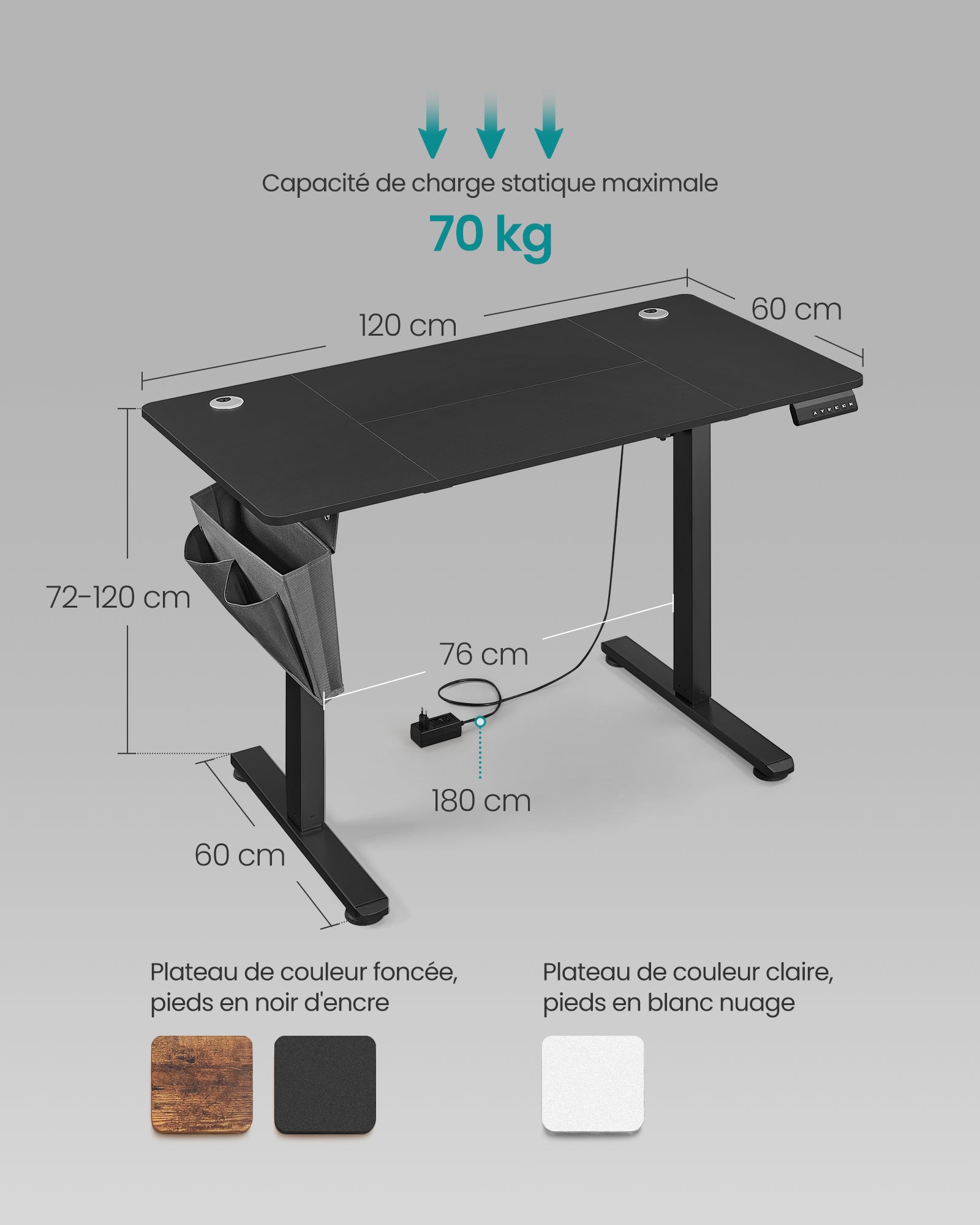 Bureau électrique assis-debout bureau réglable en hauteur 60 x 120 x (72-120) cm 4 hauteurs mémorisables pochette de rangement pour bureau noir 12_0004576