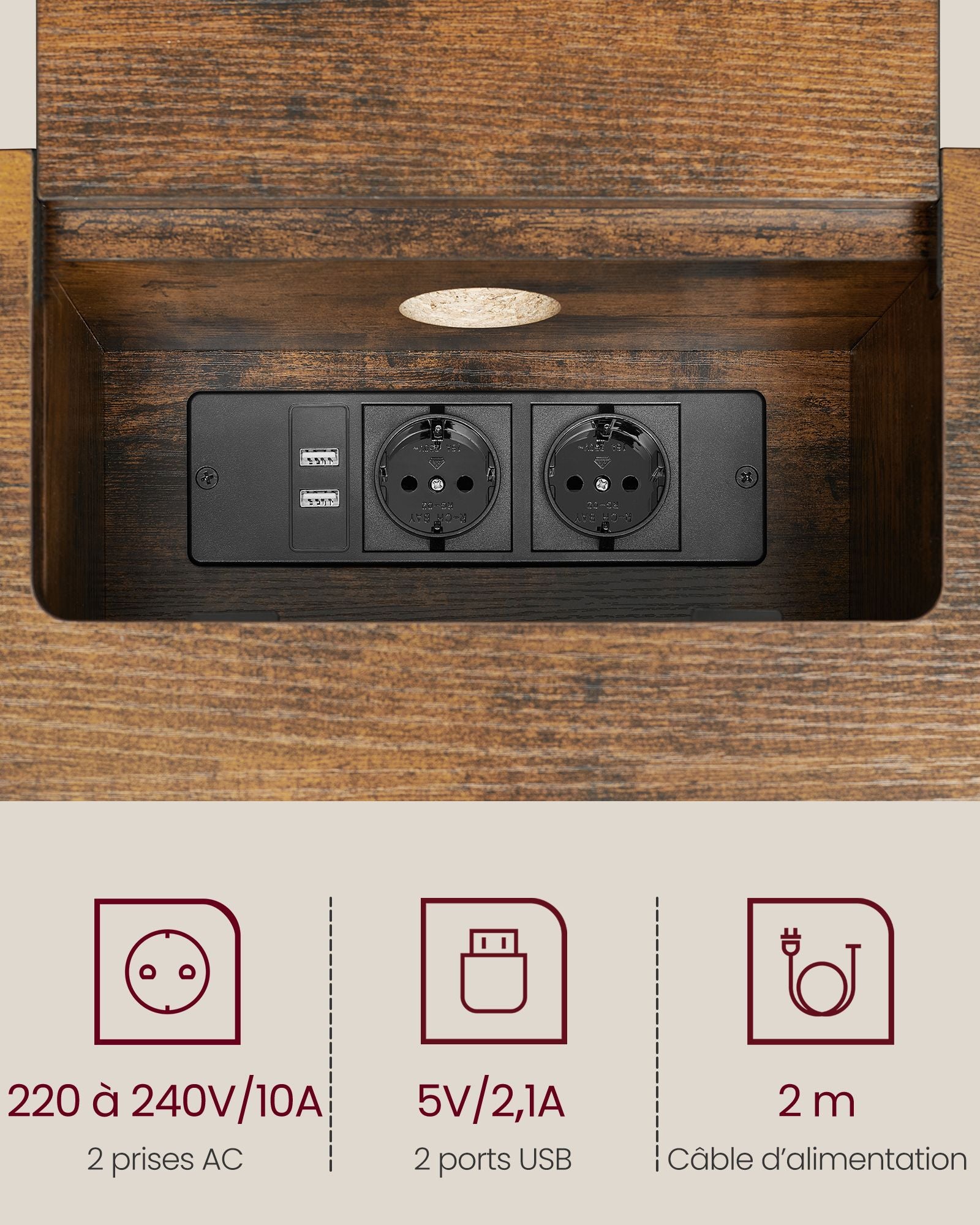 La multiprise est discrètement intégrée dans un compartiment dédié, tandis qu’un orifice à l’arrière permet de faire passer les câbles de manière ordonnée. Vous conservez ainsi une surface de table dégagée et bien organisée.