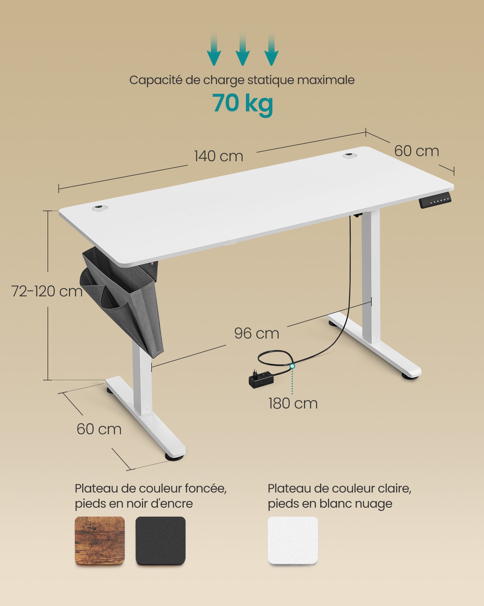 Bureau électrique assis-debout bureau réglable en hauteur 60 x 120 x (72-120) cm 4 hauteurs mémorisables pochette de rangement pour bureau blanc nuage 12_0004580