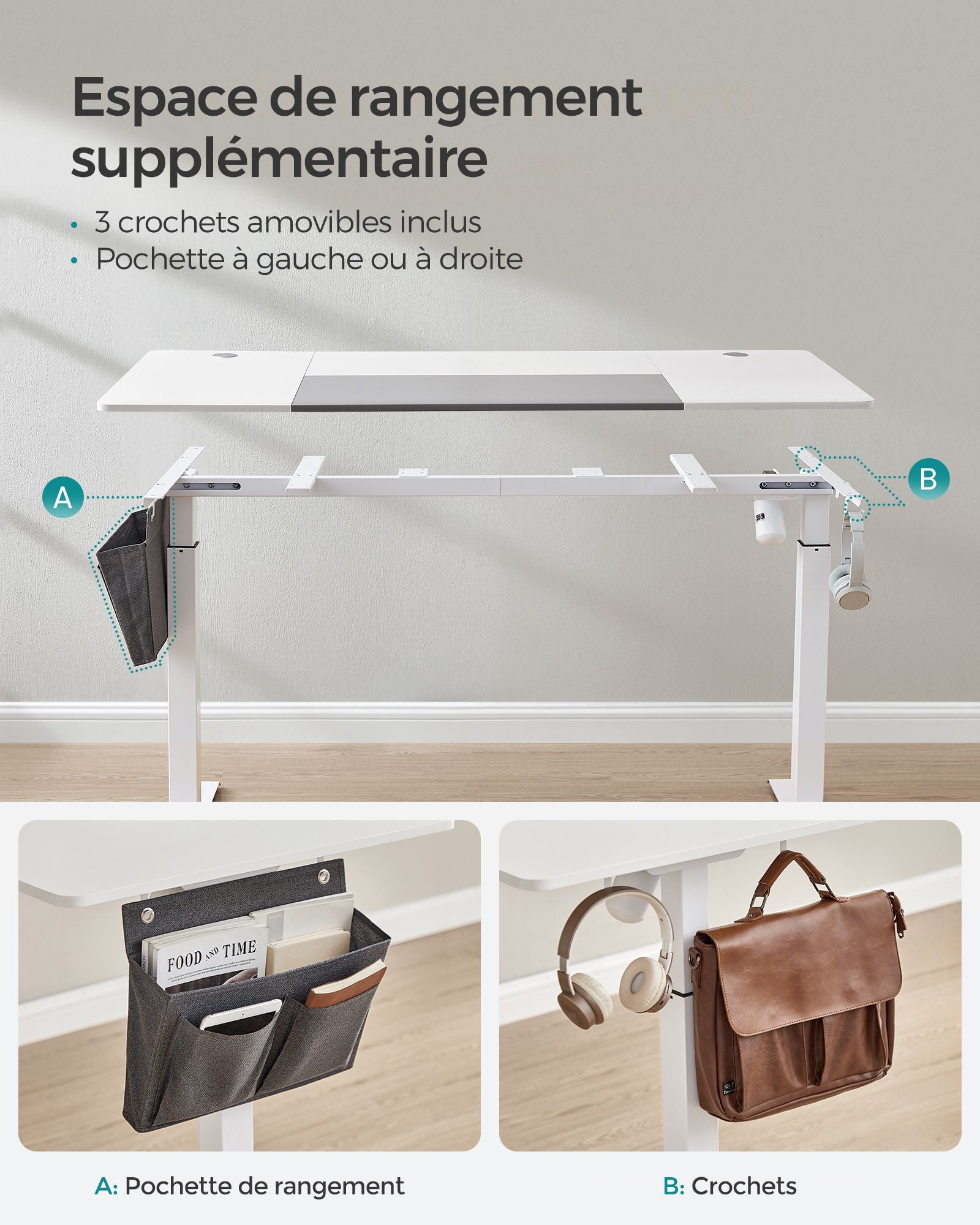 Conçu pour un espace de travail bien organisé, ce bureau est équipé d’une pochette de rangement que vous pouvez installer à droite ou à gauche pour vos livres et documents, ainsi que de trois crochets de l’autre côté pour suspendre sacs ou casques. Deux passe-câbles intégrés permettent de dissimuler les fils et d’éviter tout encombrement visuel.