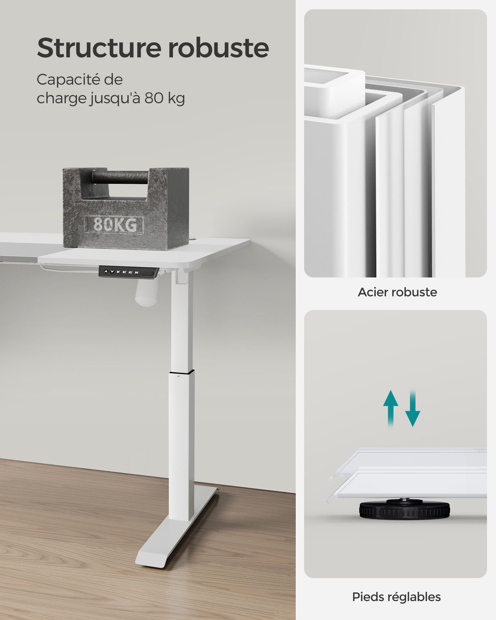 Stable et silencieux, ce bureau repose sur un cadre en acier robuste capable de supporter jusqu’à 80 kg. Son moteur offre un fonctionnement fluide et discret avec un niveau sonore inférieur à 50 dB, pour un environnement de travail calme et productif.