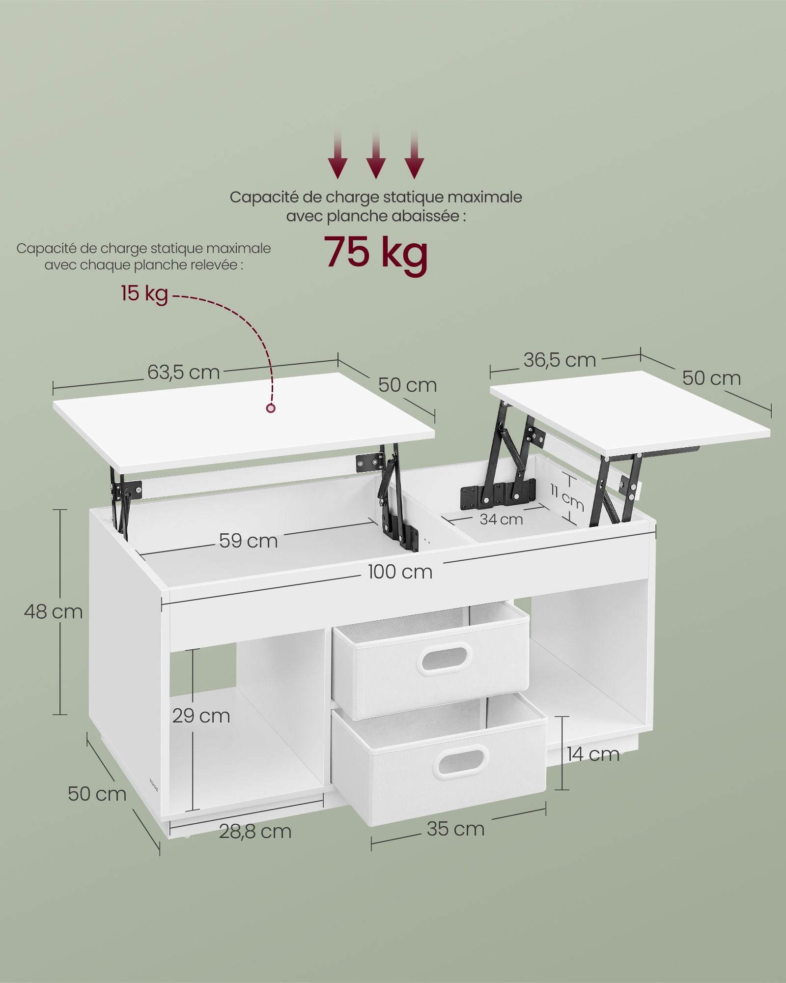 Table basse table de salon relevable avec 2 tiroirs et compartiments cachés compartiments ouverts pour salon bureau à domicile blanc 12_0007488