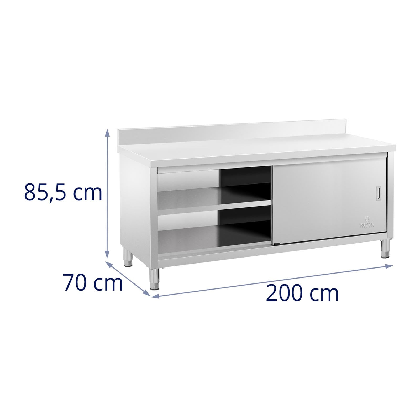 La surface de travail de 200 x 60 cm de cette armoire moderne en acier inoxydable vous offre suffisamment d’espace pour travailler au quotidien avec des aliments frais, des ingrédients et des appareils de cuisine.