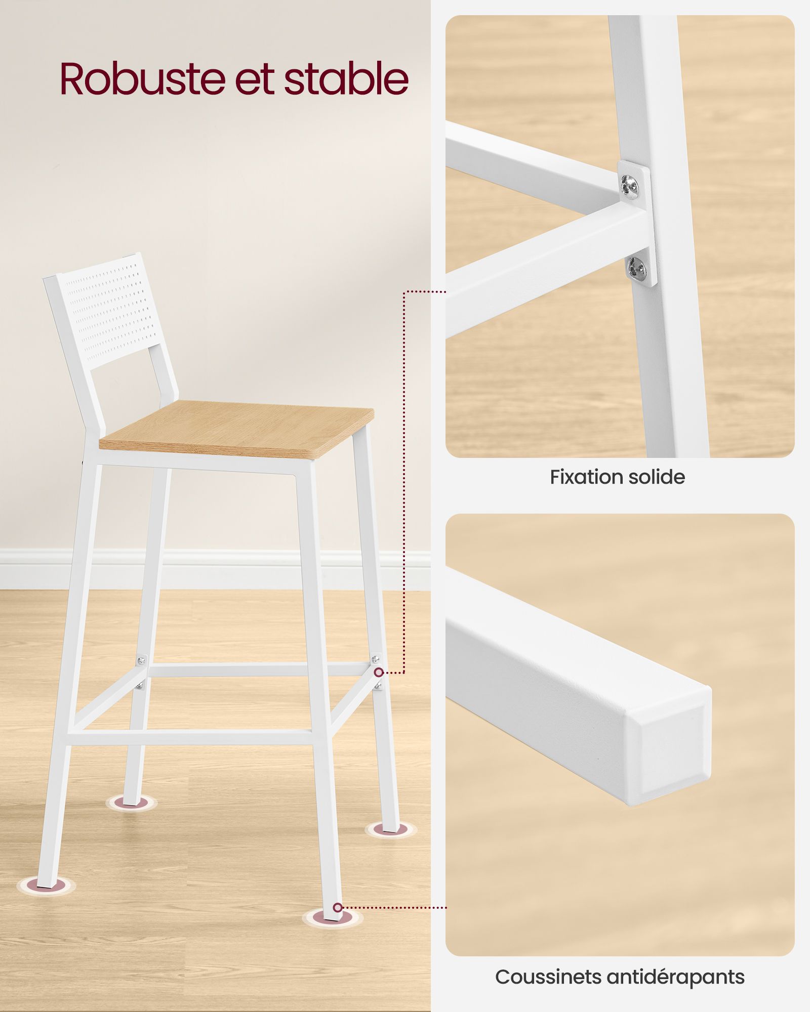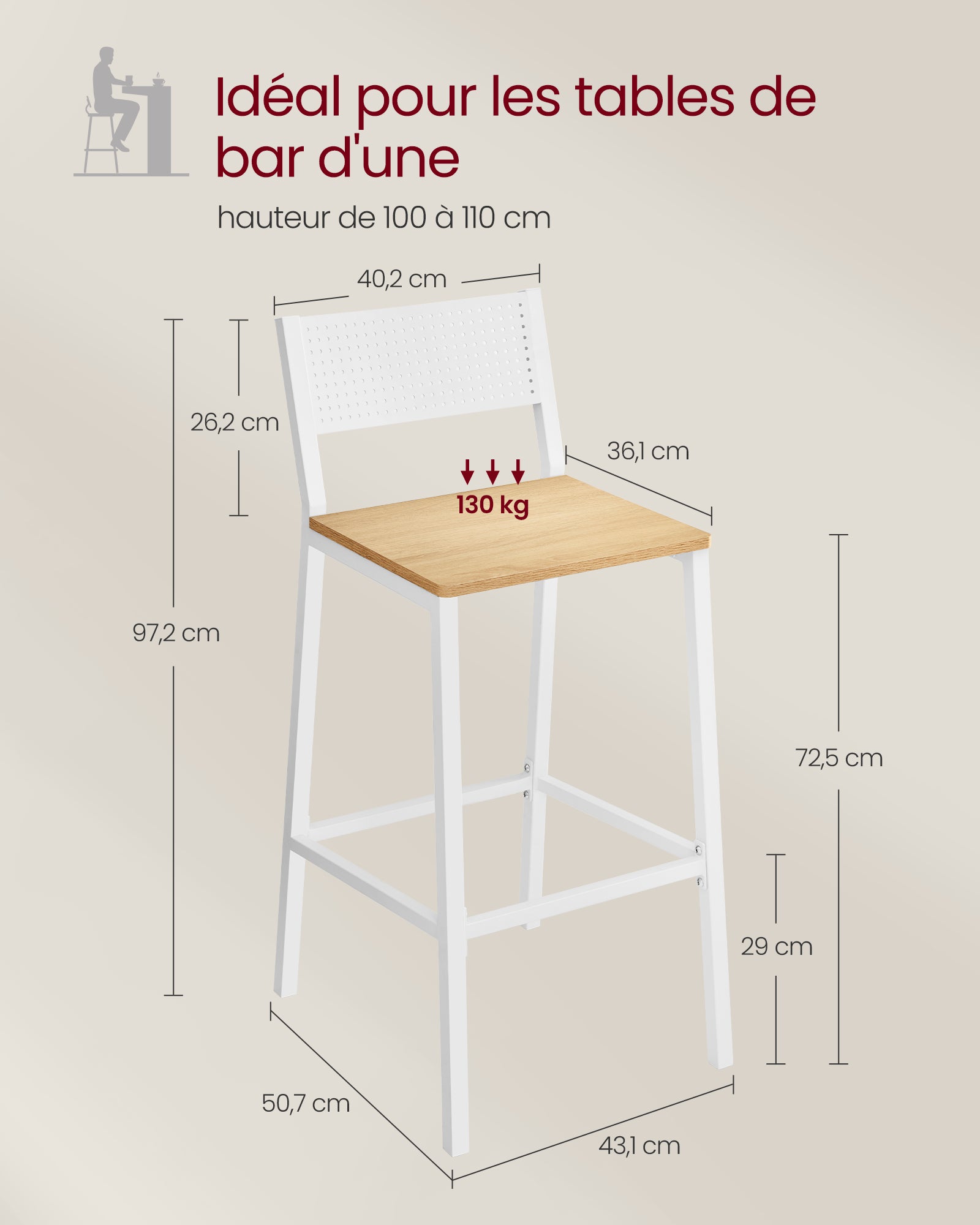 Capacité de charge statique maximale de chaque tabouret : 130 kg