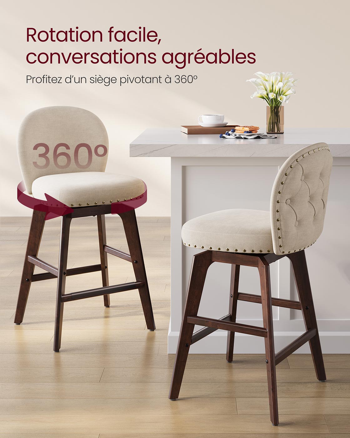 Tabourets de bar lot de 2 pivotants avec dossier et pieds en bois assise en tissu chenille hauteur d’assise 665 cm pour îlot central beige 12_0007988
