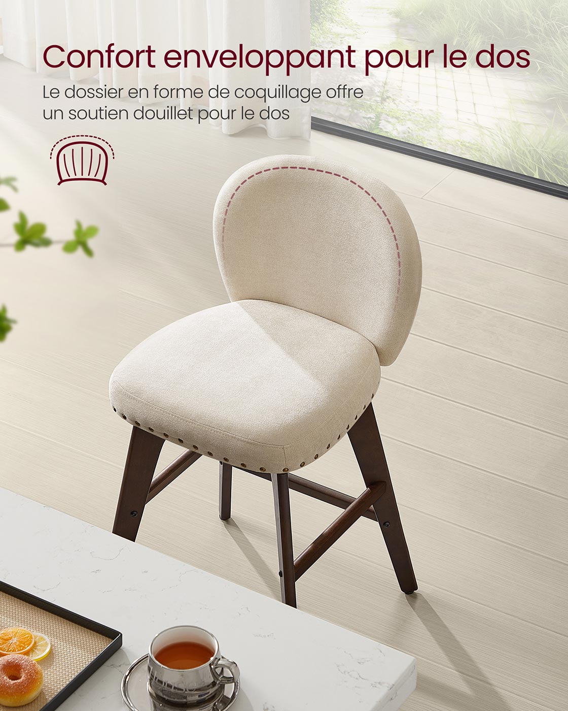 Leur tissu en chenille, doux au toucher, respirant et résistant à l’usure, apporte à la fois confort et élégance. Les détails raffinés — comme les rivets décoratifs et le capitonnage du dossier — confèrent à ces tabourets un charme vintage relevé d’une touche contemporaine.