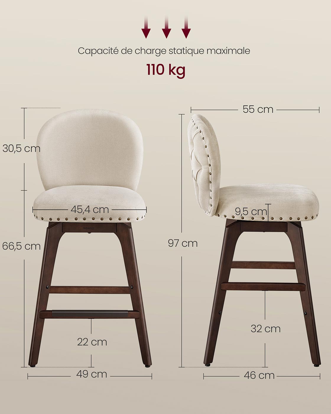 Capacité de charge statique maximale par chaise : 110 kg