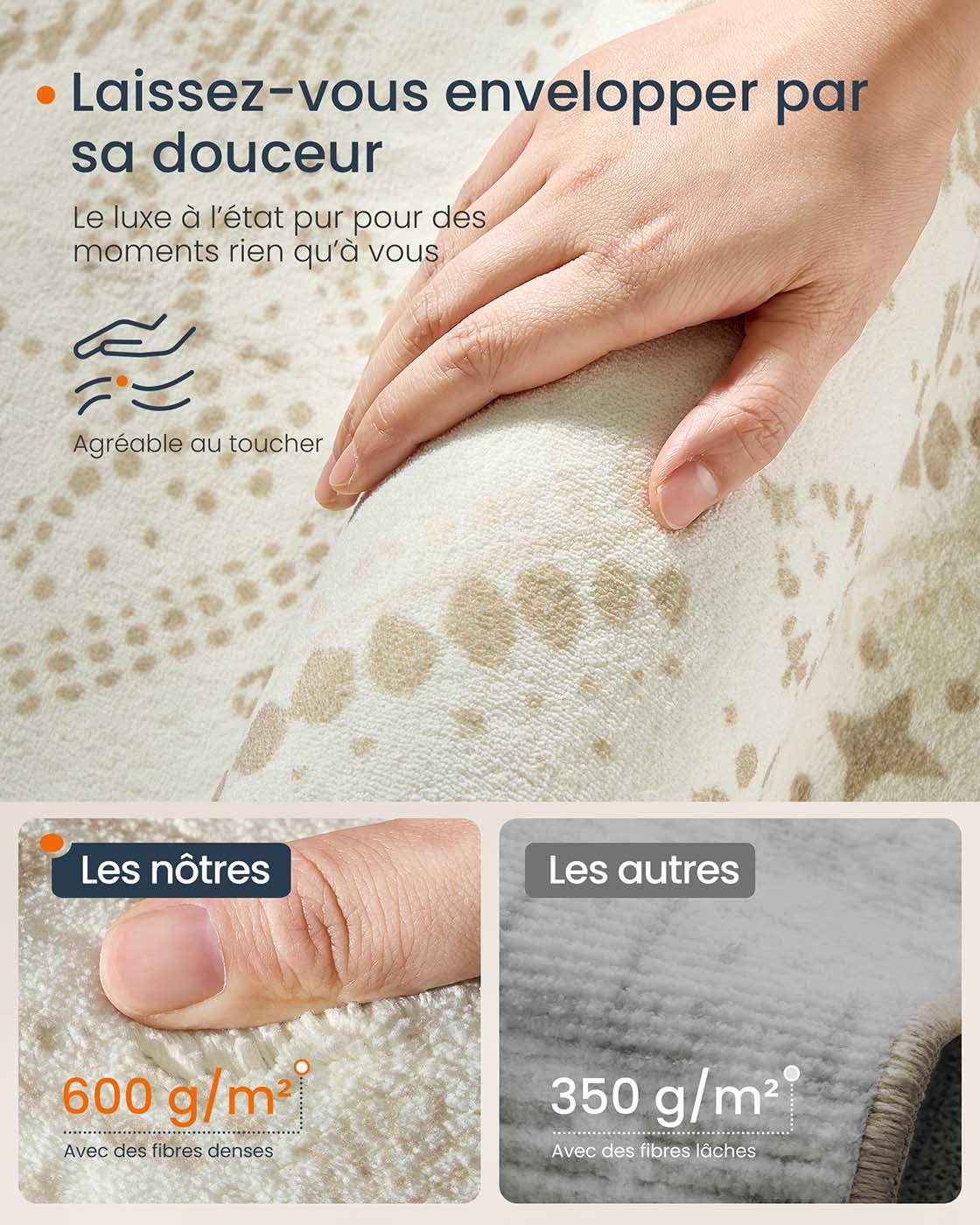 Ce tapis combine confort, style et praticité pour embellir votre intérieur. Conçu avec une surface en fibres de polyester de 600 g/㎡ et une doublure en feutre de 200 g/㎡, il offre une texture douce et agréable au toucher, parfaite pour se détendre après une longue journée, sortir du lit ou savourer un moment de lecture.
