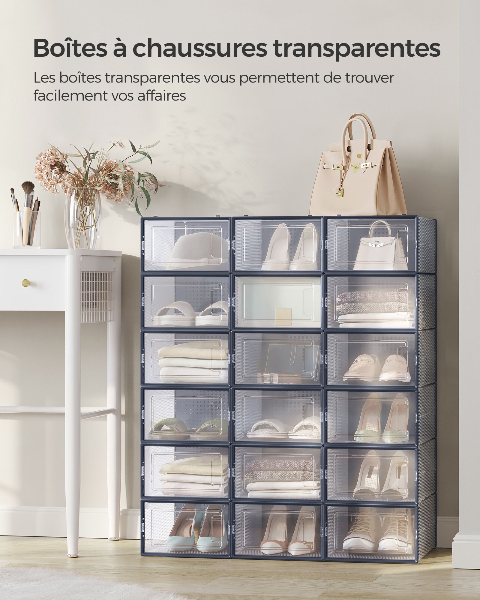 Les boîtes transparentes offrent une visibilité parfaite : vous repérez immédiatement la paire que vous cherchez sans avoir à tout ouvrir. Grâce à la porte frontale, vous accédez facilement à vos chaussures sans déplacer les autres boîtes.