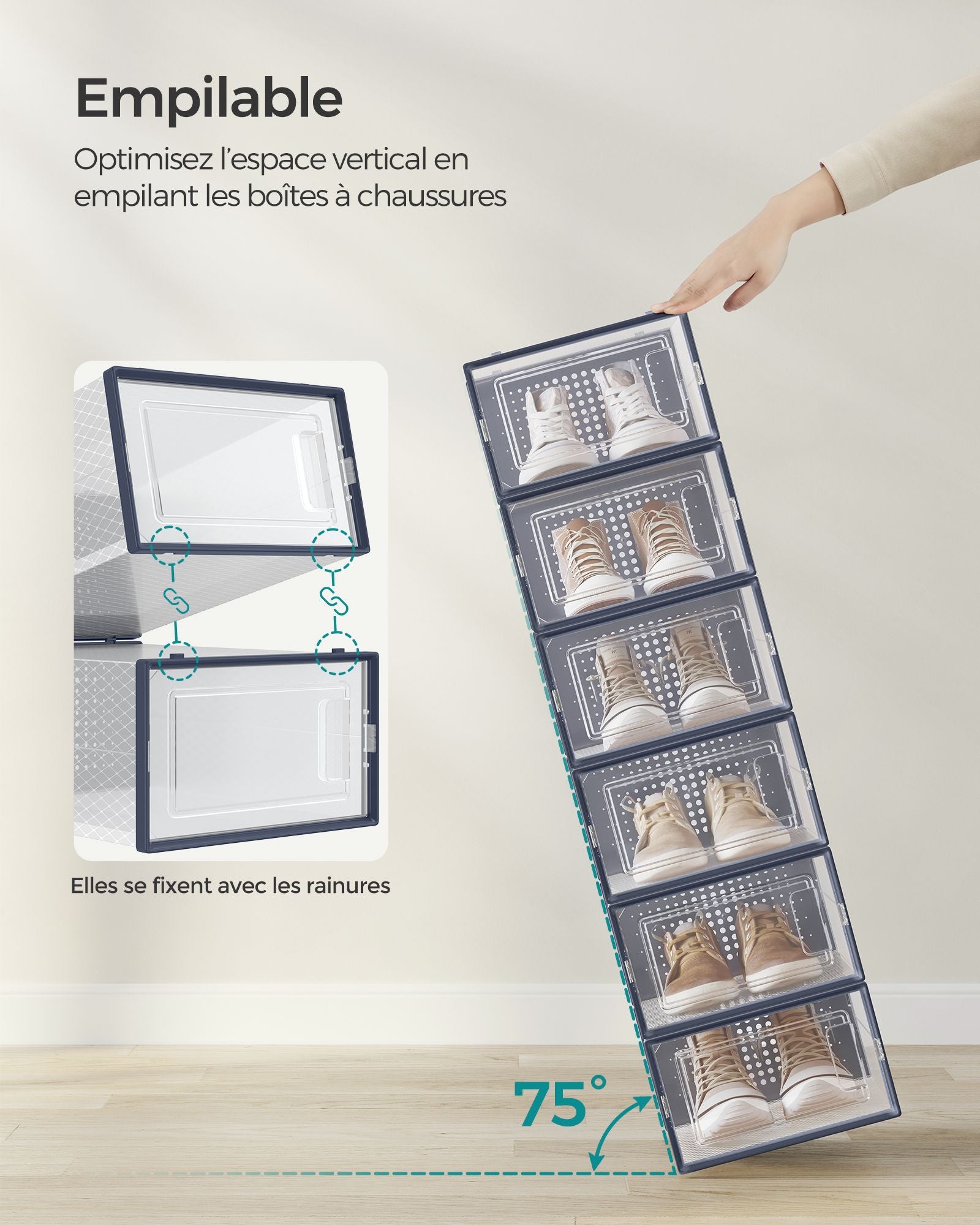 Ces boîtes sont empilables, ce qui permet de gagner de la place en hauteur tout en assurant une bonne stabilité. Les trous d’aération intégrés empêchent les mauvaises odeurs et favorisent la circulation de l’air pour garder vos chaussures fraîches et propres.