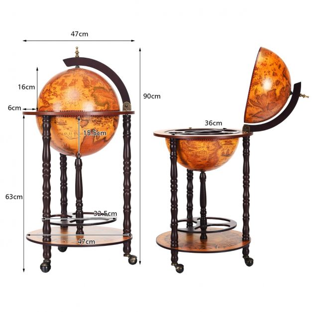 Bar globe terrestre vintage mappemonde en bois d'eucalyptus avec 3 roulettes et style italien du XVIE siècle 47 x 47 x 90cm 20_0006520